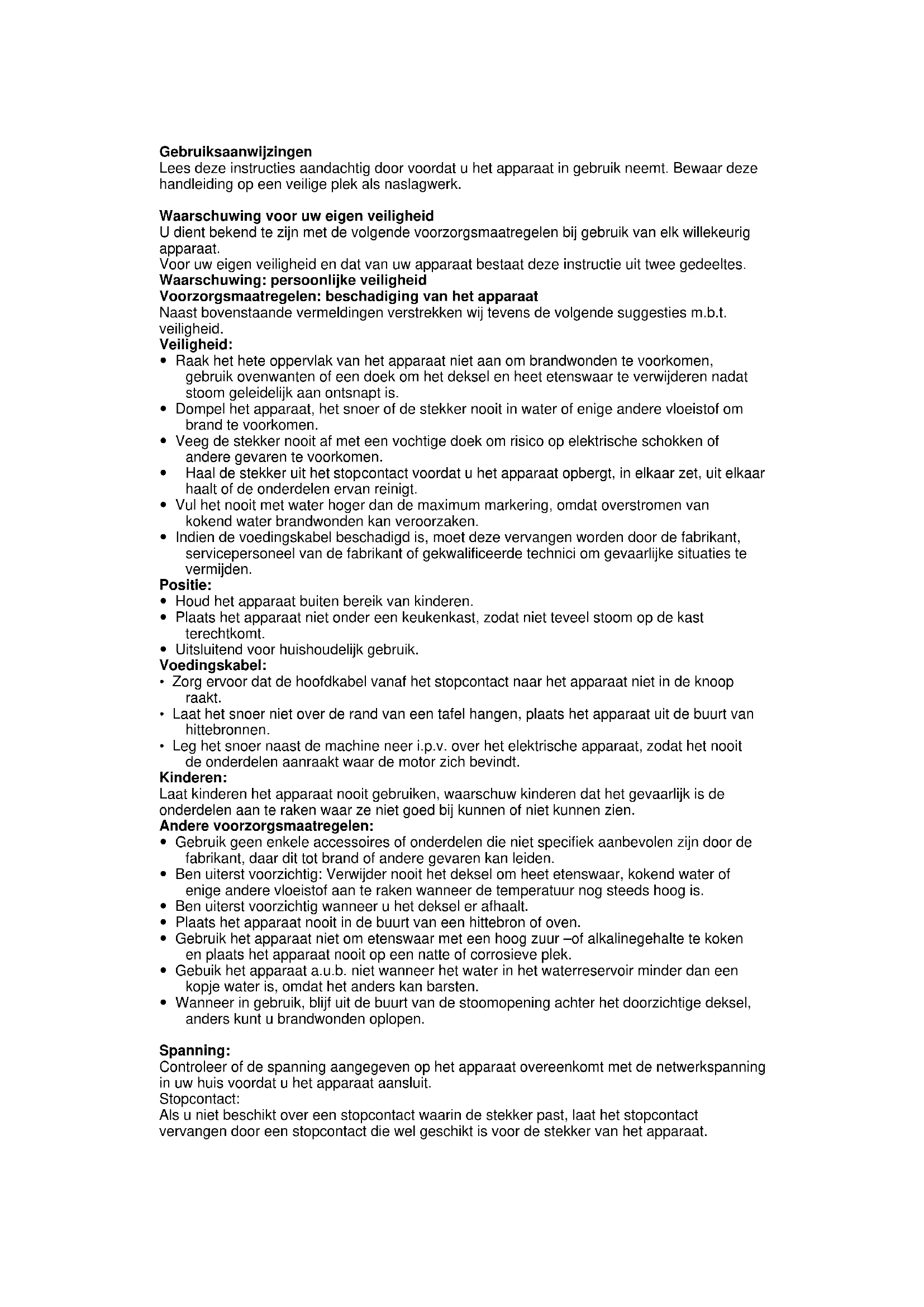 - Leg het snoer naast de machine neer i.p.v. over het elektrische apparaat, zodat het nooit de onderdelen aanraakt waar de motor zich bevindt. Kinderen: Laat kinderen het apparaat nooit gebruiken, waarschuw kinderen dat het gevaarlijk is de onderdelen aan te raken waar ze niet goed bij kunnen of niet kunnen zien. Andere voorzorgsmaatregelen: Gebruik geen enkele accessoires of onderdelen die niet specifiek aanbevolen zijn door de fabrikant, daar dit tot brand of andere gevaren kan leiden. Ben uiterst voorzichtig: Verwijder nooit het deksel om heet etenswaar, kokend water of enige andere vloeistof aan te raken wanneer de temperatuur nog steeds hoog is. Ben uiterst voorzichtig wanneer u het deksel er afhaalt. Plaats het apparaat nooit in de buurt van een hittebron of oven. Gebruik het apparaat niet om etenswaar met een hoog zuur –of alkalinegehalte te koken en plaats het apparaat nooit op een natte of corrosieve plek. Gebuik het apparaat a.u.b. niet wanneer het water in het waterreservoir minder dan een kopje water is, omdat het anders kan barsten. Wanneer in gebruik, blijf uit de buurt van de stoomopening achter het doorzichtige deksel, anders kunt u brandwonden oplopen. Spanning: Controleer of de spanning aangegeven op het apparaat overeenkomt met de netwerkspanning in uw huis voordat u het apparaat aansluit. Stopcontact: Als u niet beschikt over een stopcontact waarin de stekker past, laat het stopcontact vervangen door een stopcontact die wel geschikt is voor de stekker van het apparaat.Voorzorgsmaatregelen: Wanneer u de stekker uit het stopcontact haalt, raak nooit het metaal aan en trek het er niet te krachtig uit, om elektrische schokken of andere gevaren te voorkomen. Plaats het apparaat op de vloer voordat u het in gebruik neemt.
