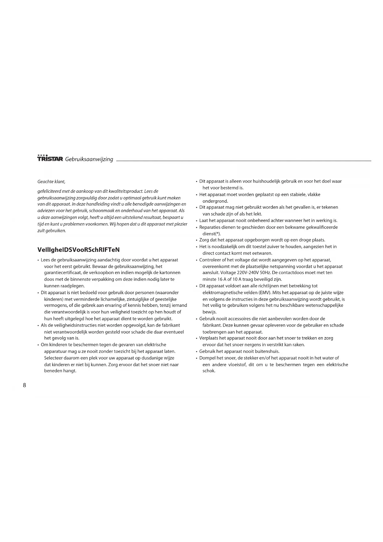 - Voor materiële schade of persoonlijk letsel veroorzaakt door ondeskundig gebruik of het niet opvolgen van de veiligheidsvoorschriften is Tristar niet aansprakelijk. In dergelijke gevallen vervalt elke aanspraak op garantie.