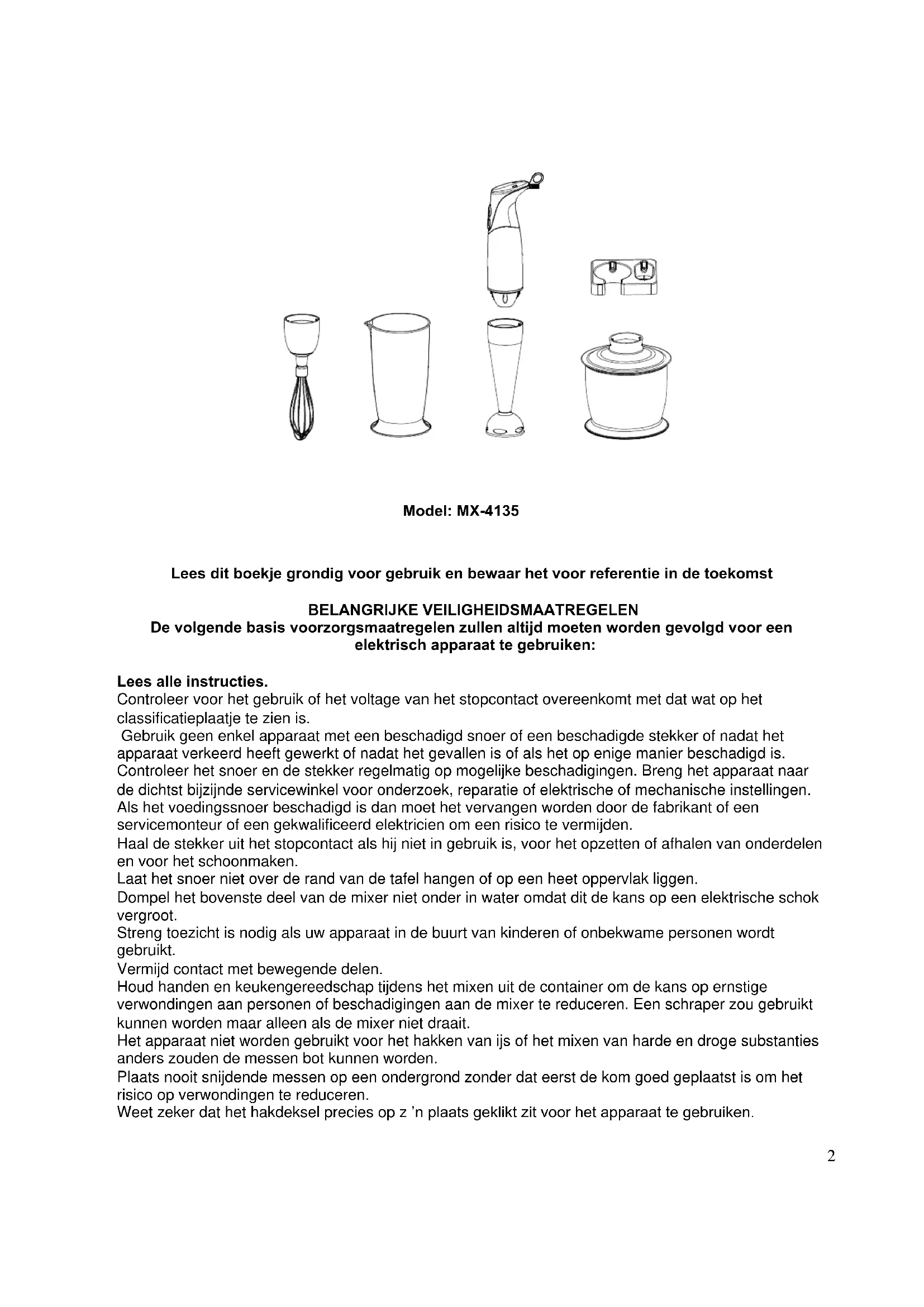 Lees dit boekje grondig voor gebruik en bewaar het voor referentie in de toekomst BELANGRIJKE VEILIGHEIDSMAATREGELEN De volgende basis voorzorgsmaatregelen zullen altijd moeten worden gevolgd voor een elektrisch apparaat te gebruiken: Lees alle instructies. Controleer voor het gebruik of het voltage van het stopcontact overeenkomt met dat wat op het classificatieplaatje te zien is. Gebruik geen enkel apparaat met een beschadigd snoer of een beschadigde stekker of nadat het apparaat verkeerd heeft gewerkt of nadat het gevallen is of als het op enige manier beschadigd is. Controleer het snoer en de stekker regelmatig op mogelijke beschadigingen. Breng het apparaat naar de dichtst bijzijnde servicewinkel voor onderzoek, reparatie of elektrische of mechanische instellingen. Als het voedingssnoer beschadigd is dan moet het vervangen worden door de fabrikant of een servicemonteur of een gekwalificeerd elektricien om een risico te vermijden. Haal de stekker uit het stopcontact als hij niet in gebruik is, voor het opzetten of afhalen van onderdelen en voor het schoonmaken. Laat het snoer niet over de rand van de tafel hangen of op een heet oppervlak liggen. Dompel het bovenste deel van de mixer niet onder in water omdat dit de kans op een elektrische schok vergroot. Streng toezicht is nodig als uw apparaat in de buurt van kinderen of onbekwame personen wordt gebruikt. Vermijd contact met bewegende delen. Houd handen en keukengereedschap tijdens het mixen uit de container om de kans op ernstige verwondingen aan personen of beschadigingen aan de mixer te reduceren. Een schraper zou gebruikt kunnen worden maar alleen als de mixer niet draait. Het apparaat niet worden gebruikt voor het hakken van ijs of het mixen van harde en droge substanties anders zouden de messen bot kunnen worden. Plaats nooit snijdende messen op een ondergrond zonder dat eerst de kom goed geplaatst is om het risico op verwondingen te reduceren. Weet zeker dat het hakdeksel precies op z ’n plaats geklikt zit voor het apparaat te gebruiken.3 Het gebruik van accessoires die niet aangeraden is door de fabrikant kan verwondingen aan personen veroorzaken. Gebruik het apparaat niet voor andere doeleinden dan daar waar het voor bedoeld is. Niet buitenshuis gebruiken. Bewaar deze instructies.