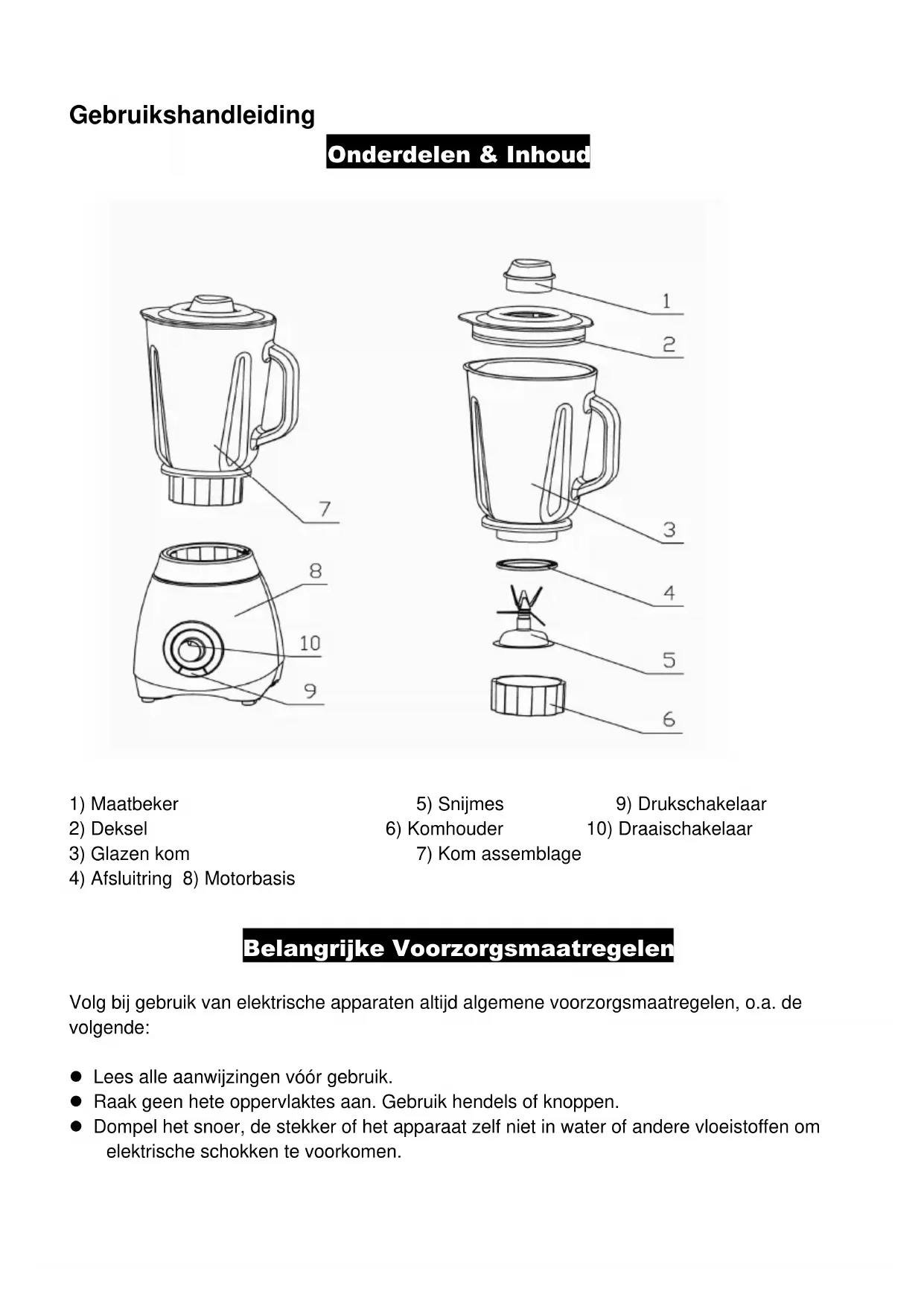 DIT PRODUCT IS UITSLUITEND VOOR HUISHOUDELIJK GEBRUIK! Vóór het eerste gebruik Alle onderdelen van de blender dienen grondig schoongemaakt te worden voordat ze voor het eerst gebruikt worden. (Zie sectie: Reiniging). Neem alleen de benodigde kabellengte van de basis van de blender eraf en steek de stekker in het stopcontact. De Glazen Kom Installeren: Plaats de rubberen afsluitring (4) op de binnenrand van het snijmes (5). Plaats het snijmes met de afsluitring op de komhouder (6). Plaats de in elkaar gestoken Komhouder op de bodem van de glazen kom en draai deze stevig vast. Monteer de Maatbeker (1) op het deksel (2). Bevestig het Deksel op de Glazen Kom en druk omlaag. De Glazen Kom bevestigen: Zorg ervoor dat de blender is uitgeschakeld (Schakelaar op stand ‘0’). Plaats de glazen kom assemblage (7) op de motorbasis (8) en druk omlaag totdat deze stevig vastzit. Hoe te gebruiken o Doe de te bereiden etenswaar in de glazen kom. o Plaats het deksel op de glazen kom en sluit het goed af. Plaats de maatbeker in het gat in het deksel en draai het rechtsom om af te sluiten. o Schakel de motorbasis aan: Snelheidsinstelling Gebruik 1 (Laag) voor licht gebruik met vloeistoffen 2 (Hoog) voor vastere samenstellingen – voor het mixen van vloeibaar en vast etenswaar 0 uitschakelen P (Pulsinstelling) korte, krachtige pulsbewegingen Drukschakelaar voor ijs malen en schoonmaken van de glazen kom, maar metde draaischakelaar op stand ‘0’ (De schakelaar blijft niet permanent in gesteld op stand “P” of “Drukschakelaar”. U dient de schakelaar ingedrukt te houden op stand “P” of “Drukschakelaar” of deze meerdere keren indrukken)