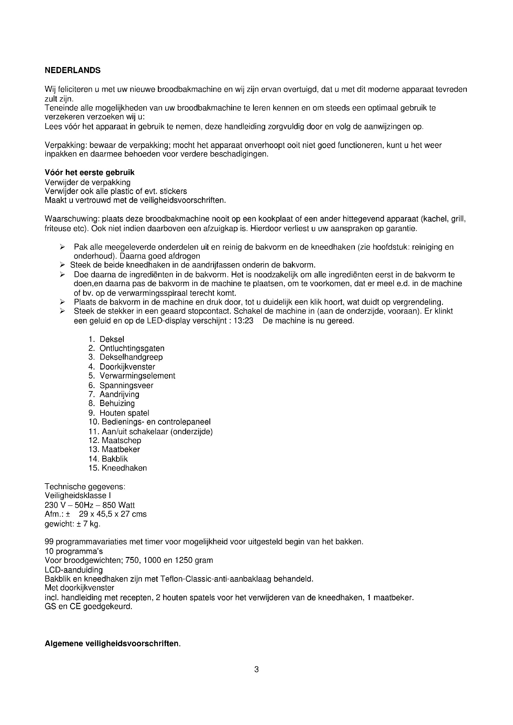 Technische gegevens: Veiligheidsklasse I 230 V – 50Hz – 850 Watt Afm.: ± 29 x 45,5 x 27 cms gewicht: ± 7 kg. 99 programmavariaties met timer voor mogelijkheid voor uitgesteld begin van het bakken. 10 programma’s Voor broodgewichten; 750, 1000 en 1250 gram LCD-aanduiding Bakblik en kneedhaken zijn met Teflon-Classic-anti-aanbaklaag behandeld. Met doorkijkvenster incl. handleiding met recepten, 2 houten spatels voor het verwijderen van de kneedhaken, 1 maatbeker. GS en CE goedgekeurd.