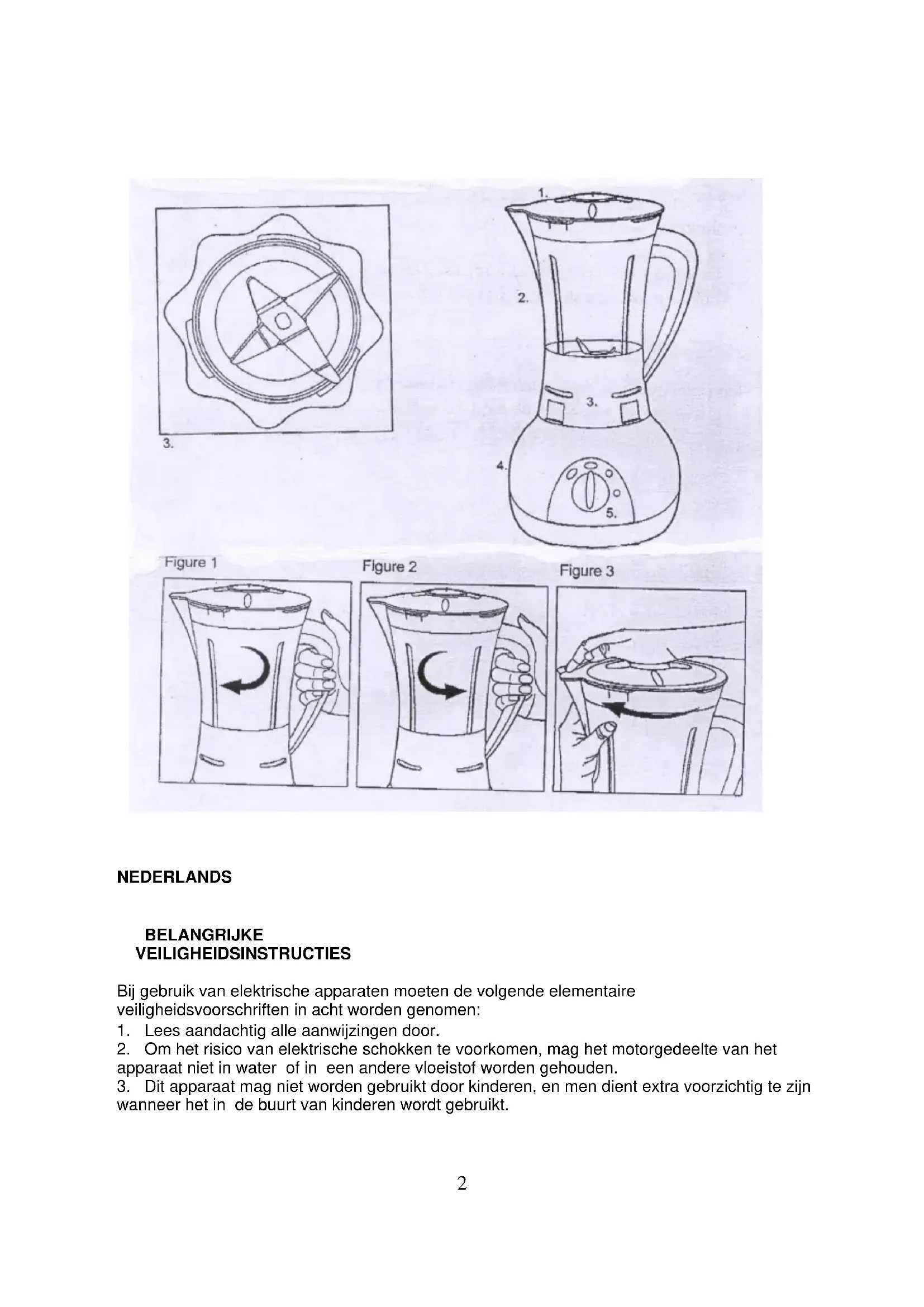 Aan de onderzijde bevindt zich een motorbeveiliging, welke in werking treedt zodra de blender is overladen: laat de blender 30 minuten afkoelen en druk daarna de rode pin in. Alvorens de eerste keer te gebruiken; eerst alle losse delen in warm sop afwassen, afspoelen en drogen. a. Plaats het motorblok op een stabiele, vlakke ondergrond b. schroef het messengedeelte en de rubber ring vast aan de beker c. plaats de beker op de koppeling en draai hem stevig op zijn plaats: Voorzichtig; de messen zijn scherp ! d. duw de deksel goed op zijn plaats.: de blender zal niet werken indien de deksel niet goed op zijn plaats zit.4 De blender nooit inschakelen voordat alle onderdelen juist en stevig zijn geassembleerd. Was de ingrediënten en snijd deze in stukjes zodat ze door de vulopening passen. De beker heeft een capaciteit van 1,5 liter: Overlaad de beker niet ! De machine nooit ledig laten draaien: de motor kan doorbranden. Draai de knop in stand “2” en het werk zal in een paar minuten gereed zijn.: herhalen indien nodig. De “Pulse”-knop stelt U in staat om het proces heel precies te beheersen: de motor draait dan in een hoog toerental. In de stand “O” zal de motor stoppen. Draai nooit met te zware of te dikke materialen: als U hoort, dat de motor niet soepel loopt, stop dan de machine, voeg wat vloeistof toe, draai in “P”-stand enige seconden, help door middel van de spatel de inhoud door elkaar te draaien (motor uitgeschakeld) of verwijder eventueel te grote inhoud uit de beker. REINIGING