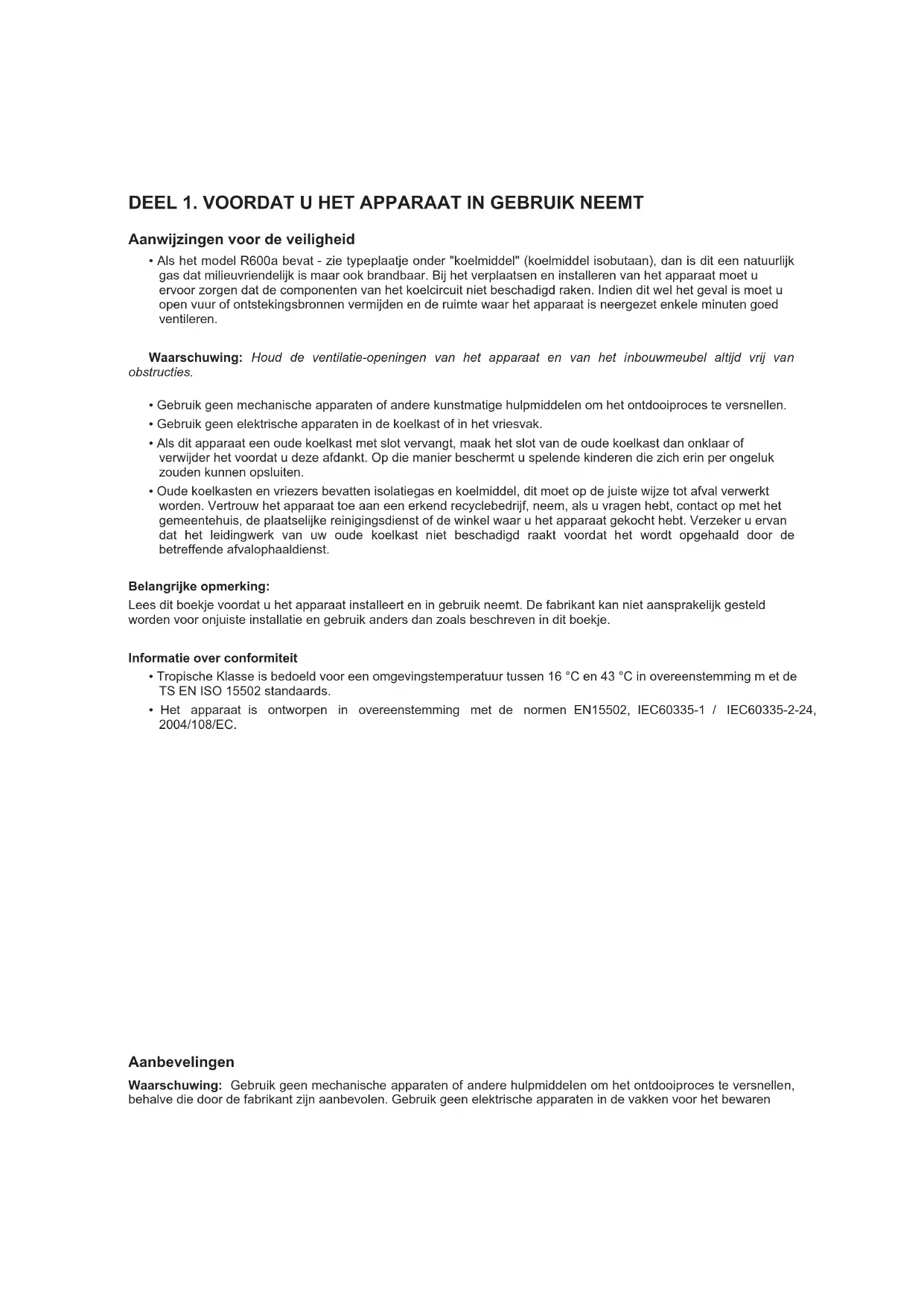 - Het apparaat is ontworpen in overeenstemming met de normen EN15502, IEC60335-1 / IEC60335-2-24, 2004/108/EC. Aanbevelingen Waarschuwing: Gebruik geen mechanische apparaten of andere hulpmiddelen om het ontdooiproces te versnellen, behalve die door de fabrikant zijn aanbevolen. Gebruik geen elektrische apparaten in de vakken voor het bewarenvan levensmiddelen, behalve als die zijn aanbevolen door de fabrikant. Houd ventilatie-openingen van het apparaat of van het inbouwmeubel vrij van obstructies. Beschadig het koelcircuit niet.