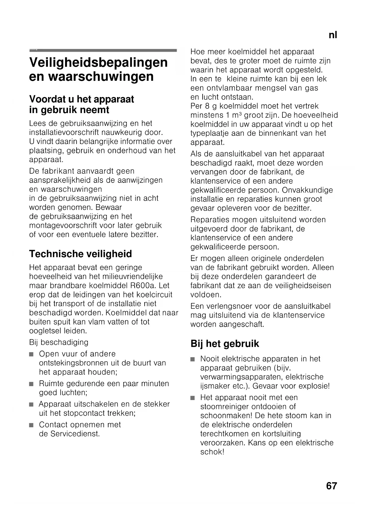 nlIn houd nlGebruiksaanwijzing Veiligheidsbepalingen en waarschuwingen Voordat u het apparaat in gebruik neemt Lees de gebruiksaanwijzing en het installatievoorschrift nauwkeurig door. U vindt daarin belangrijke informatie over plaatsing, gebruik en onderhoud van het apparaat. De fabrikant aanvaardt geen aansprakelijkheid als de aanwijzingen en waarschuwingen in de gebruiksaanwijzing niet in acht worden genomen. Bewaar de gebruiksaanwijzing en het montagevoorschrift voor later gebruik of voor een eventuele latere bezitter. Technische veiligheid Het apparaat bevat een geringe hoeveelheid van het milieuvriendelijke maar brandbare koelmiddel R600a. Let erop dat de leidingen van het koelcircuit bij het transport of de installatie niet beschadigd worden. Koelmiddel dat naar buiten spuit kan vlam vatten of tot oogletsel leiden. Bij beschadiging ■ Open vuur of andere ontstekingsbronnen uit de buurt van het apparaat houden; ■ Ruimte gedurende een paar minuten goed luchten; ■ Apparaat uitschakelen en de stekker uit het stopcontact trekken; ■ Contact opnemen met de Servicedienst. Hoe meer koelmiddel het apparaat bevat, des te groter moet de ruimte zijn waarin het apparaat wordt opgesteld. In een te kleine ruimte kan bij een lek een ontvlambaar mengsel van gas en lucht ontstaan. Per 8 g koelmiddel moet het vertrek minstens 1 m³ groot zijn. De hoeveelheid koelmiddel in uw apparaat vindt u op het typeplaatje aan de binnenkant van het apparaat. Als de aansluitkabel van het apparaat beschadigd raakt, moet deze worden vervangen door de fabrikant, de klantenservice of een andere gekwalificeerde persoon. Onvakkundige installatie en reparaties kunnen groot gevaar opleveren voor de bezitter. Reparaties mogen uitsluitend worden uitgevoerd door de fabrikant, de klantenservice of een andere gekwalificeerde persoon. Er mogen alleen originele onderdelen van de fabrikant gebruikt worden. Alleen bij deze onderdelen garandeert de fabrikant dat ze aan de veiligheidseisen voldoen. Een verlengsnoer voor de aansluitkabel mag uitsluitend via de klantenservice worden aangeschaft. Bij het gebruik ■ Nooit elektrische apparaten in het apparaat gebruiken (bijv. verwarmingsapparaten, elektrische ijsmaker etc.). Gevaar voor explosie! ■ Het apparaat nooit met een stoomreiniger ontdooien of schoonmaken! De hete stoom kan in de elektrische onderdelen terechtkomen en kortsluiting veroorzaken. Kans op een elektrische schok!nl