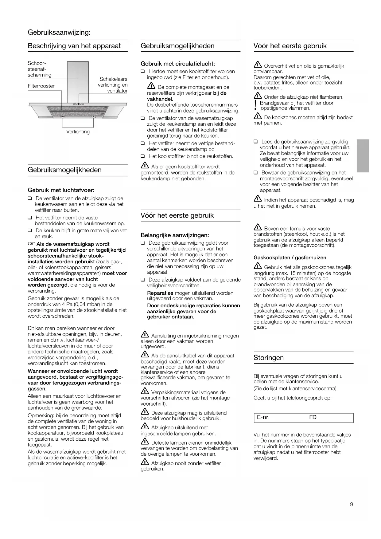Storingen Bij eventuele vragen of storingen kunt u bellen met de klantenservice. (Zie de lijst met klantenservicecentra).Geeft u bij het telefoongesprek op: E-nr. FD Vul het nummer in de bovenstaande vakjesin. De nummers staan op het typeplaatjedat u vindt in de binnenruimte van de afzuigkap nadat u het filterrooster hebt verwijderd. Vóór het eerste gebruik Vóór het eerste gebruik Belangrijke aanwijzingen:q Deze gebruiksaanwijzing geldt voor verschillende uitvoeringen van het apparaat. Het is mogelijk dat er een aantal kenmerken worden beschrevendie niet van toepassing zijn op uw apparaat.q Deze afzuigkap voldoet aan de geldendeveiligheidsvoorschriften.Reparaties mogen uitsluitend wordenuitgevoerd door een vakman.Door ondeskundige reparaties kunnenaanzienlijke gevaren voor de gebruiker ontstaan.q Lees de gebruiksaanwijzing zorgvuldigvoordat u het nieuwe apparaat gebruikt.Ze bevat belangrijke informatie voor uwveiligheid en voor het gebruik en hetonderhoud van het apparaat.q Bewaar de gebruiksaanwijzing en hetmontagevoorschrift zorgvuldig, eventueelvoor een volgende bezitter van het apparaat. 몇 Indien het apparaat beschadigd is, mag u het niet in gebruik nemen. 몇 Boven een fornuis voor vaste brandstoffen (steenkool, hout e.d.) is hetgebruik van de afzuigkap alleen beperkttoegestaan (zie montagevoorschrift).Gaskookplaten / gasfornuizen 몇 Gebruik niet alle gaskookzones tegelijk langdurig (max. 15 minuten) op de hoogstestand, anders bestaat er kans op brandwonden bij aanraking van de oppervlakken van de behuizing en gevaarvan beschadiging van de afzuigkap.Bij gebruik van de afzuigkap boven eengaskookplaat waarvan gelijktijdig drie ofmeer gaskookzones worden gebruikt, moetde afzuigkap op de maximumstand wordengezet. 몇 Aansluiting en ingebruikneming mogen alleen door een vakman worden uitgevoerd. 몇 Als de aansluitkabel van dit apparaat beschadigd raakt, moet deze worden vervangen door de fabrikant, diens klantenservice of een andere gekwalificeerde vakman, om gevaren tevoorkomen. 몇 Verpakkingsmateriaal volgens de voorschriften afvoeren (zie het montage-voorschrift). 몇 Deze afzuigkap mag is uitsluitend bedoeld voor huishoudelijk gebruik. 몇 Afzuigkap uitsluitend met ingeschroefde lampen gebruiken. 몇 Defecte lampen dienen onmiddellijk vervangen te worden om overbelasting vande overige lampen te voorkomen. 몇 Afzuigkap nooit zonder vetfilter gebruiken.Gebruik met circulatielucht:q Hiertoe moet een koolstoffilter wordeningebouwd (zie Filter en onderhoud). 몇 De complete montageset en de reservefilters zijn verkrijgbaar bij de vakhandel.De desbetreffende toebehorennummersvindt u achterin deze gebruiksaanwijzing.q De ventilator van de wasemafzuigkapzuigt de keukendamp aan en leidt dezedoor het vetfilter en het koolstoffilter gereinigd terug naar de keuken.q Het vetfilter neemt de vettige bestand-delen van de keukendamp opq Het koolstoffilter bindt de reukstoffen. 몇 Als er geen koolstoffilter wordt gemonteerd, worden de reukstoffen in dekeukendamp niet gebonden. 몇 Oververhit vet en olie is gemakkelijk ontvlambaar.Daarom gerechten met vet of olie, b.v. patates frites, alleen onder toezicht toebereiden. 몇 Onder de afzuigkap niet flamberen. Brandgevaar bij het vetfilter door ! opstijgende vlammen. 몇 De kookzones moeten altijd zijn bedekt met pannen.10 몇 De keukenwasem wordt op de doeltreffendste manier verwijderd door:q Inschakelen van de afzuigkapbij het begin van het koken.q Uitschakelen van de afzuigkappas enkele minuten na het einde van hetkoken. Bedienen van de wasemafzuig kap Ventilator inschakelen:q Druk op de toets +.Gewenste ventilatorstand instellen:q Druk op de toets +.De ventilator wordt een stand hogeringesteld.q Druk op de toets –.De ventilator wordt een stand lager ingesteld.Ventilator uitschakelen:q Druk op de toets 0. Of: q Druk op de toets – een aantal keren intotdat de ventilator wordt uitgeschakeld.Intensieve stand:Met de intensieve stand wordt het hoogstevermogen bereikt. Dit is voor korte tijdnodig.q Druk op de toets + een aantal keren intotdat de aanduiding gaat branden.q Als de intensieve stand niet met de handwordt uitgeschakeld, wordt de ventilatorna 10 minuten automatisch naar stand teruggeschakeld.Verlichting:q De verlichting kan op elk moment worden gebruikt, ook als de ventilator isuitgeschakeld.Ventilator uitLichtaan / uit