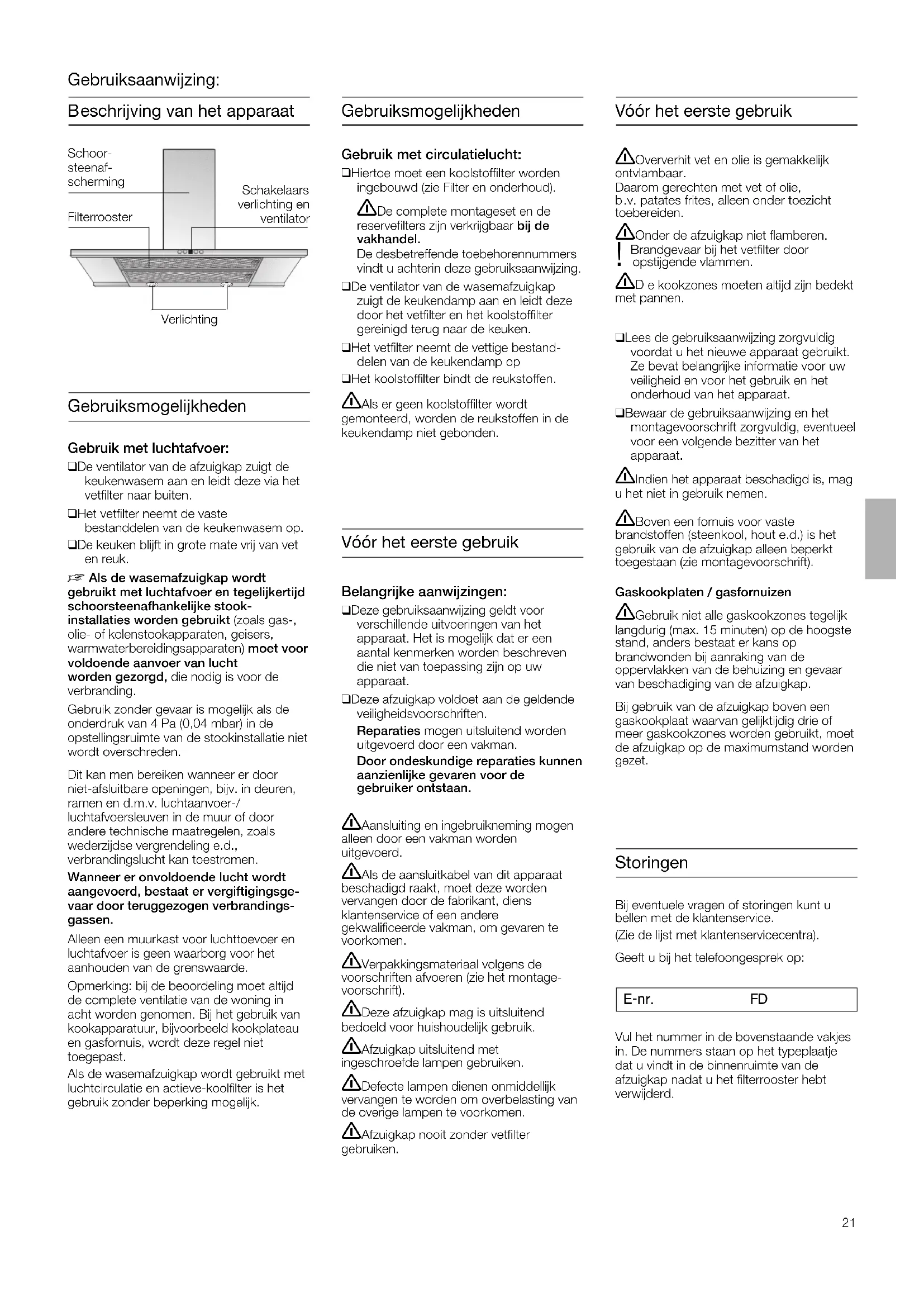 eschrijving van het apparaat Gebruiksmogelijkheden Gebruik met luchtafvoer:q De ventilator van de afzuigkap zuigt dekeukenwasem aan en leidt deze via hetvetfilter naar buiten.q Het vetfilter neemt de vaste bestanddelen van de keukenwasem op.q De keuken blijft in grote mate vrij van veten reuk. Als de wasemafzuigkap wordtgebruikt met luchtafvoer en tegelijkertijdschoorsteenafhankelijke stook-installaties worden gebruikt (zoals gas-,olie- of kolenstookapparaten, geisers,warmwaterbereidingsapparaten) moet voorvoldoende aanvoer van luchtworden gezorgd, die nodig is voor de verbranding.Gebruik zonder gevaar is mogelijk als deonderdruk van 4 Pa (0,04 mbar) in deopstellingsruimte van de stookinstallatie nietwordt overschreden. Gebruiksmogelijkheden Dit kan men bereiken wanneer er door niet-afsluitbare openingen, bijv. in deuren,ramen en d.m.v. luchtaanvoer-/luchtafvoersleuven in de muur of doorandere technische maatregelen, zoalswederzijdse vergrendeling e.d., verbrandingslucht kan toestromen.Wanneer er onvoldoende lucht wordtaangevoerd, bestaat er vergiftigingsge-vaar door teruggezogen verbrandings-gassen.Alleen een muurkast voor luchttoevoer enluchtafvoer is geen waarborg voor het aanhouden van de grenswaarde.Opmerking: bij de beoordeling moet altijdde complete ventilatie van de woning inacht worden genomen. Bij het gebruik vankookapparatuur, bijvoorbeeld kookplateauen gasfornuis, wordt deze regel niettoegepast.Als de wasemafzuigkap wordt gebruikt metluchtcirculatie en actieve-koolfilter is hetgebruik zonder beperking mogelijk. Gebruiksaanwijzing: VerlichtingFilterroosterSchoor-steenaf-schermingSchakelaarsverlichting enventilatorGebruik met circulatielucht:q Hiertoe moet een koolstoffilter wordeningebouwd (zie Filter en onderhoud). 몇 De complete montageset en de reservefilters zijn verkrijgbaar bij de vakhandel.De desbetreffende toebehorennummersvindt u achterin deze gebruiksaanwijzing.q De ventilator van de wasemafzuigkapzuigt de keukendamp aan en leidt dezedoor het vetfilter en het koolstoffilter gereinigd terug naar de keuken.q Het vetfilter neemt de vettige bestand-delen van de keukendamp opq Het koolstoffilter bindt de reukstoffen. 몇 Als er geen koolstoffilter wordt gemonteerd, worden de reukstoffen in dekeukendamp niet gebonden. Storingen Bij eventuele vragen of storingen kunt u bellen met de klantenservice. (Zie de lijst met klantenservicecentra).Geeft u bij het telefoongesprek op: E-nr. FD Vul het nummer in de bovenstaande vakjesin. De nummers staan op het typeplaatjedat u vindt in de binnenruimte van de afzuigkap nadat u het filterrooster hebt verwijderd. Vóór het eerste gebruik