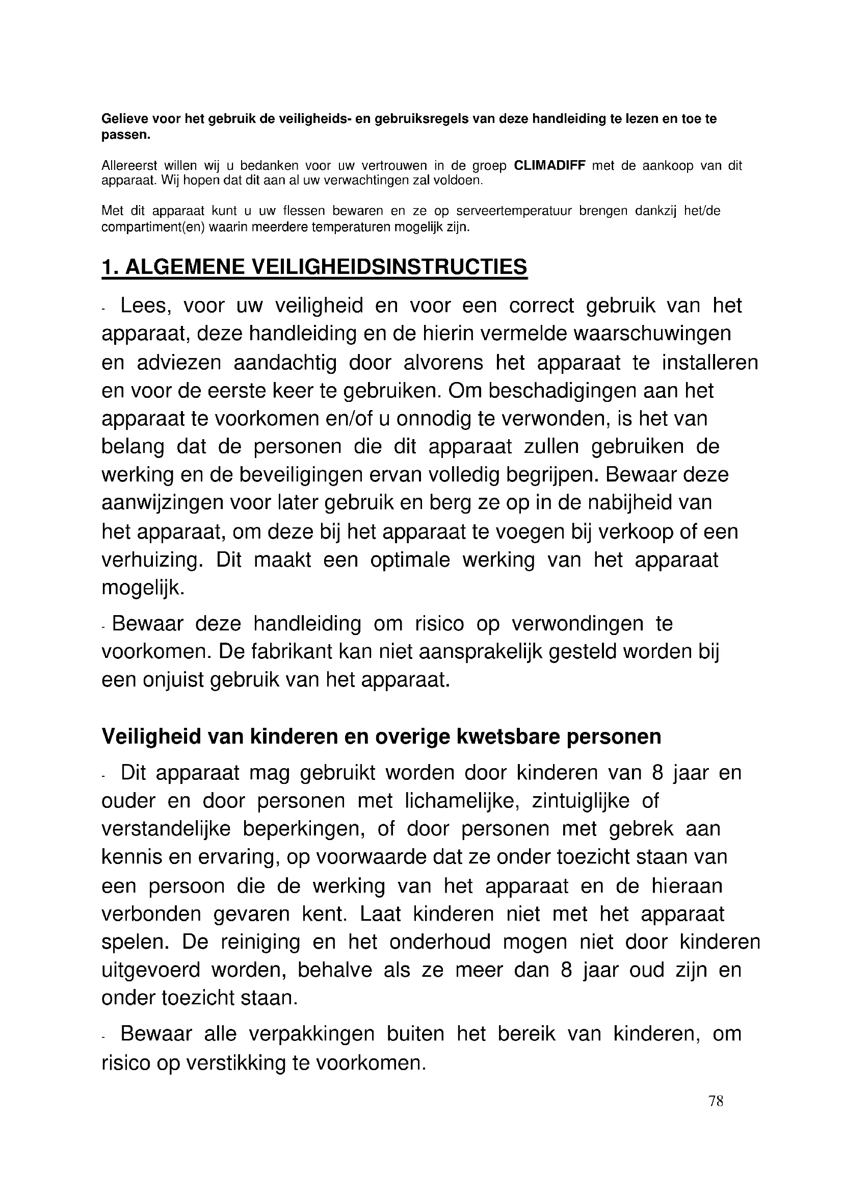 Dieses Gerät ist ausschließlich zur Lagerung von Wein bestimmt.78 Gelieve voor het gebruik de veiligheids- en gebruiksregels van deze handleiding te lezen en toe te passen. Allereerst willen wij u bedanken voor uw vertrouwen in de groep CLIMADIFF met de aankoop van dit apparaat. Wij hopen dat dit aan al uw verwachtingen zal voldoen. Met dit apparaat kunt u uw flessen bewaren en ze op serveertemperatuur brengen dankzij het/de compartiment(en) waarin meerdere temperaturen mogelijk zijn.
