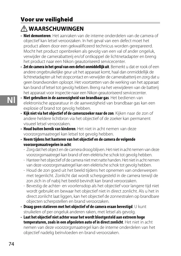 • Niet demonteren. Het aanraken van de interne onderdelen van de camera of objectief kan letsel veroorzaken. In het geval van een defect moet het product alleen door een gekwalificeerd technicus worden gerepareerd. Mocht het product openbreken als gevolg van een val of ander ongeluk, verwijder de camerabatterij en/of ontkoppel de lichtnetadapter en breng het product naar een Nikon geautoriseerd servicecenter. • Zet de camera in het geval van een defect onmiddellijk uit. Bemerkt u dat er rook of een andere ongebruikelijke geur uit het apparaat komt, haal dan onmiddellijk de lichtnetadapter uit het stopcontact en verwijder de camerabatterij en zorg dat u geen brandwonden oploopt. Het voortzetten van de werking van het apparaat kan brand of letsel tot gevolg hebben. Breng na het verwijderen van de batterij het apparaat voor inspectie naar een Nikon geautoriseerd servicecenter. • Niet gebruiken in de aanwezigheid van brandbaar gas. Het bedienen van elektronische apparatuur in de aanwezigheid van brandbaar gas kan een explosie of brand tot gevolg hebben. • Kijk niet via het objectief of de camerazoeker naar de zon. Kijken naar de zon of andere heldere lichtbron via het objectief of de zoeker kan permanent visueel letsel veroorzaken. • Houd buiten bereik van kinderen. Het niet in acht nemen van deze voorzorgsmaatregel kan letsel tot gevolg hebben. • Neem tijdens het hanteren van het objectief en de camera de volgende voorzorgsmaatregelen in acht: - Zorg dat het object en de camera droog blijven. Het niet in acht nemen van deze voorzorgsmaatregel kan brand of een elektrische schok tot gevolg hebben. - Hanteer het objectief of de camera niet met natte handen. Het niet in acht nemen van deze voorzorgsmaatregel kan een elektrische schok tot gevolg hebben. - Houd de zon goed uit het beeld tijdens het opnemen van onderwerpen met tegenlicht. Zonlicht dat wordt scherpgesteld in de camera terwijl de zon zich in of nabij het beeld bevindt kan brand veroorzaken. - Bevestig de achter- en voorlensdop als het objectief voor langere tijd niet wordt gebruikt en bewaar het objectief niet in direct zonlicht. Als u het in direct zonlicht laat liggen, kan het objectief de zonnestralen op brandbare objecten scherpstellen en brand veroorzaken. • Draag geen statieven met het objectief of de camera eraan bevestigd. U kunt struikelen of per ongeluk anderen raken, met letsel als gevolg. • Laat het objectief niet achter waar het wordt blootgesteld aan extreem hoge temperaturen, zoals in een afgesloten auto of in direct zonlicht. Het niet in acht nemen van deze voorzorgsmaatregel kan de interne onderdelen van het objectief nadelig beïnvloeden en brand veroorzaken.