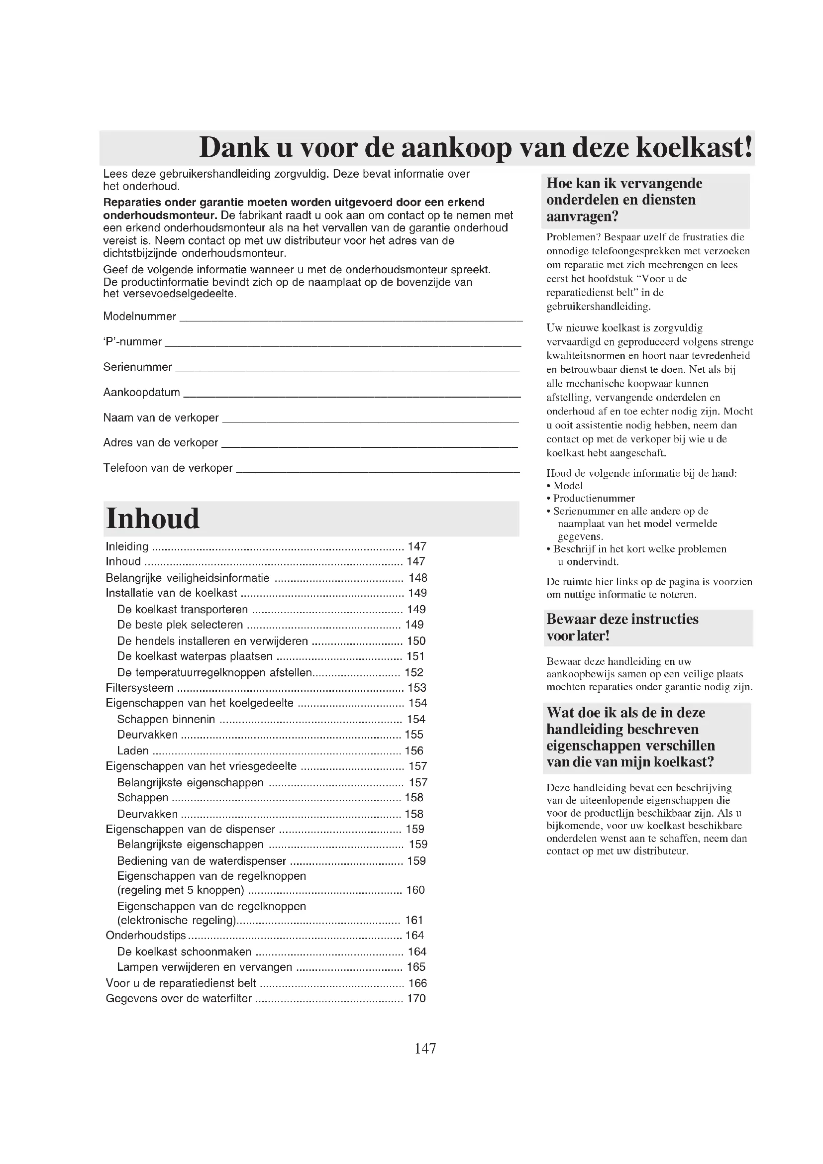 Deze handleiding bevat een beschrijving van de uiteenlopende eigenschappen die voor de productijn beschikbaar zijn. Als u bijkomende, voor uw koelkast beschikbare onderdelen wenst aan te schaffen, neem dan contact op met uw distributeur.