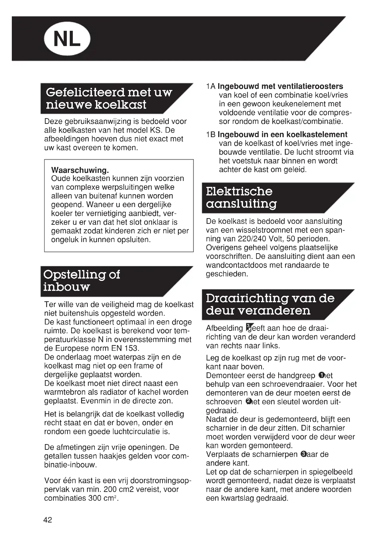Gefeliciteerd met uw nieuwe koelkast Opstelling of inbouw Elektrische aansluiting Draairichting van de deur veranderen NL43