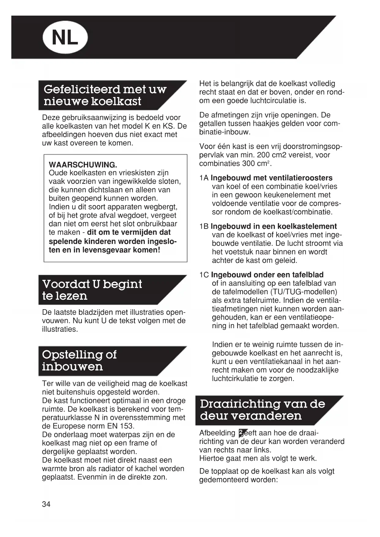 Deze gebruiksaanwijzing is bedoeld voor alle koelkasten van het model K en KS. De afbeeldingen hoeven dus niet exact met uw kast overeen te komen. WAARSCHUWING. Oude koelkasten en vrieskisten zijn vaak voorzien van ingewikkelde sloten, die kunnen dichtslaan en alleen van buiten geopend kunnen worden. Indien u dit soort apparaten wegbergt, of bij het grote afval wegdoet, vergeet dan niet om eerst het slot onbruikbaar te maken - dit om te vermijden dat spelende kinderen worden ingeslo- ten en in levensgevaar komen! De laatste bladzijden met illustraties open- vouwen. Nu kunt U de tekst volgen met de illustraties. Ter wille van de veiligheid mag de koelkast niet buitenshuis opgesteld worden. De kast functioneert optimaal in een droge ruimte. De koelkast is berekend voor tem- peratuurklasse N in overensstemming met de Europese norm EN 153. De onderlaag moet waterpas zijn en de koelkast mag niet op een frame of dergelijke geplaatst worden. De koelkast moet niet direkt naast een warmte bron als radiator of kachel worden geplaatst. Evenmin in de direkte zon. Het is belangrijk dat de koelkast volledig recht staat en dat er boven, onder en rond- om een goede luchtcirculatie is. De afmetingen zijn vrije openingen. De getallen tussen haakjes gelden voor com- binatie-inbouw. Voor één kast is een vrij doorstromingsop- pervlak van min. 200 cm2 vereist, voor combinaties 300 cm
