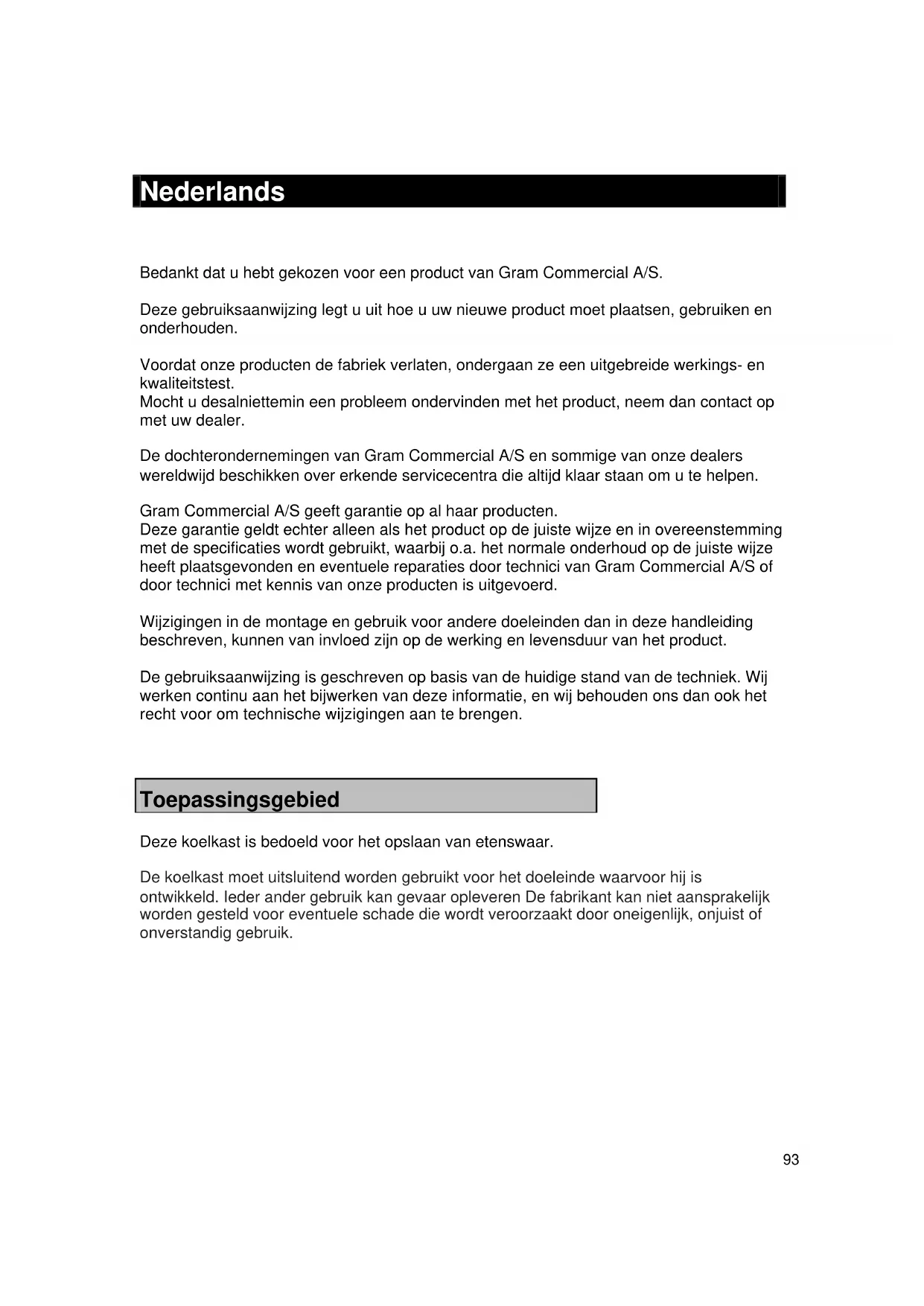 Bedankt dat u hebt gekozen voor een product van Gram Commercial A/S. Deze gebruiksaanwijzing legt u uit hoe u uw nieuwe product moet plaatsen, gebruiken en onderhouden. Voordat onze producten de fabriek verlaten, ondergaan ze een uitgebreide werkings- en kwaliteitstest. Mocht u desalniettemin een probleem ondervinden met het product, neem dan contact op met uw dealer. De dochterondernemingen van Gram Commercial A/S en sommige van onze dealers wereldwijd beschikken over erkende servicecentra die altijd klaar staan om u te helpen. Gram Commercial A/S geeft garantie op al haar producten. Deze garantie geldt echter alleen als het product op de juiste wijze en in overeenstemming met de specificaties wordt gebruikt, waarbij o.a. het normale onderhoud op de juiste wijze heeft plaatsgevonden en eventuele reparaties door technici van Gram Commercial A/S of door technici met kennis van onze producten is uitgevoerd. Wijzigingen in de montage en gebruik voor andere doeleinden dan in deze handleiding beschreven, kunnen van invloed zijn op de werking en levensduur van het product. De gebruiksaanwijzing is geschreven op basis van de huidige stand van de techniek. Wij werken continu aan het bijwerken van deze informatie, en wij behouden ons dan ook het recht voor om technische wijzigingen aan te brengen.
