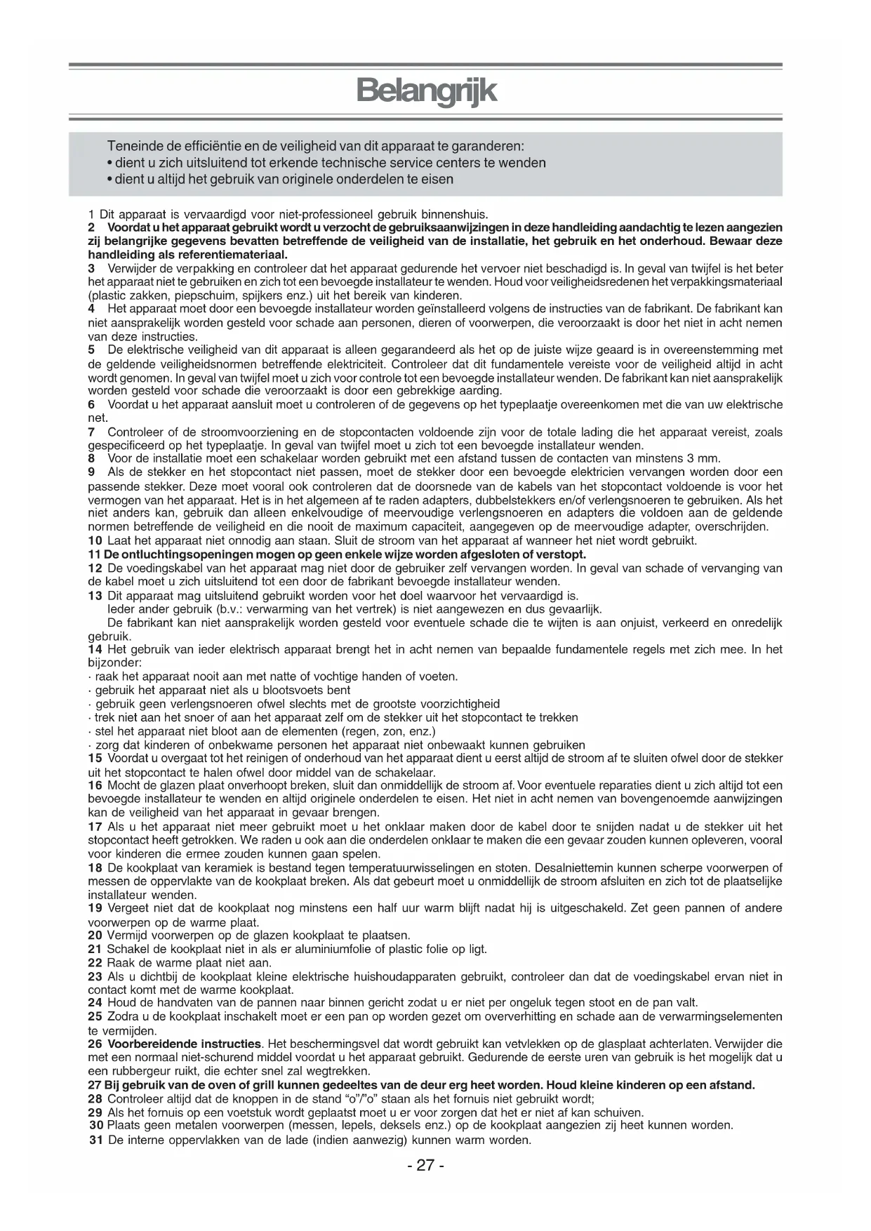 - zorg dat kinderen of onbekwame personen het apparaat niet onbewaakt kunnen gebruiken 15 Voordat u overgaat tot het reinigen of onderhoud van het apparaat dient u eerst altijd de stroom af te sluiten ofwel door de stekker uit het stopcontact te halen ofwel door middel van de schakelaar. 16 Mocht de glazen plaat onverhoopt breken, sluit dan onmiddellijk de stroom af. Voor eventuele reparaties dient u zich altijd tot een bevoegde installateur te wenden en altijd originele onderdelen te eisen. Het niet in acht nemen van bovengenoemde aanwijzingen kan de veiligheid van het apparaat in gevaar brengen. 17 Als u het apparaat niet meer gebruikt moet u het onklaar maken door de kabel door te snijden nadat u de stekker uit het stopcontact heeft getrokken. We raden u ook aan die onderdelen onklaar te maken die een gevaar zouden kunnen opleveren, vooral voor kinderen die ermee zouden kunnen gaan spelen. 18 De kookplaat van keramiek is bestand tegen temperatuurwisselingen en stoten. Desalniettemin kunnen scherpe voorwerpen of messen de oppervlakte van de kookplaat breken. Als dat gebeurt moet u onmiddellijk de stroom afsluiten en zich tot de plaatselijke installateur wenden. 19 Vergeet niet dat de kookplaat nog minstens een half uur warm blijft nadat hij is uitgeschakeld. Zet geen pannen of andere voorwerpen op de warme plaat. 20 Vermijd voorwerpen op de glazen kookplaat te plaatsen. 21 Schakel de kookplaat niet in als er aluminiumfolie of plastic folie op ligt. 22 Raak de warme plaat niet aan. 23 Als u dichtbij de kookplaat kleine elektrische huishoudapparaten gebruikt, controleer dan dat de voedingskabel ervan niet in contact komt met de warme kookplaat. 24 Houd de handvaten van de pannen naar binnen gericht zodat u er niet per ongeluk tegen stoot en de pan valt. 25 Zodra u de kookplaat inschakelt moet er een pan op worden gezet om oververhitting en schade aan de verwarmingselementen te vermijden. 26 Voorbereidende instructies. Het beschermingsvel dat wordt gebruikt kan vetvlekken op de glasplaat achterlaten. Verwijder die met een normaal niet-schurend middel voordat u het apparaat gebruikt. Gedurende de eerste uren van gebruik is het mogelijk dat u een rubbergeur ruikt, die echter snel zal wegtrekken. 27 Bij gebruik van de oven of grill kunnen gedeeltes van de deur erg heet worden. Houd kleine kinderen op een afstand. 28 Controleer altijd dat de knoppen in de stand “o”/”o” staan als het fornuis niet gebruikt wordt; 29 Als het fornuis op een voetstuk wordt geplaatst moet u er voor zorgen dat het er niet af kan schuiven. 30 Plaats geen metalen voorwerpen (messen, lepels, deksels enz.) op de kookplaat aangezien zij heet kunnen worden. 31 De interne oppervlakken van de lade (indien aanwezig) kunnen warm worden. Teneinde de efficiëntie en de veiligheid van dit apparaat te garanderen: