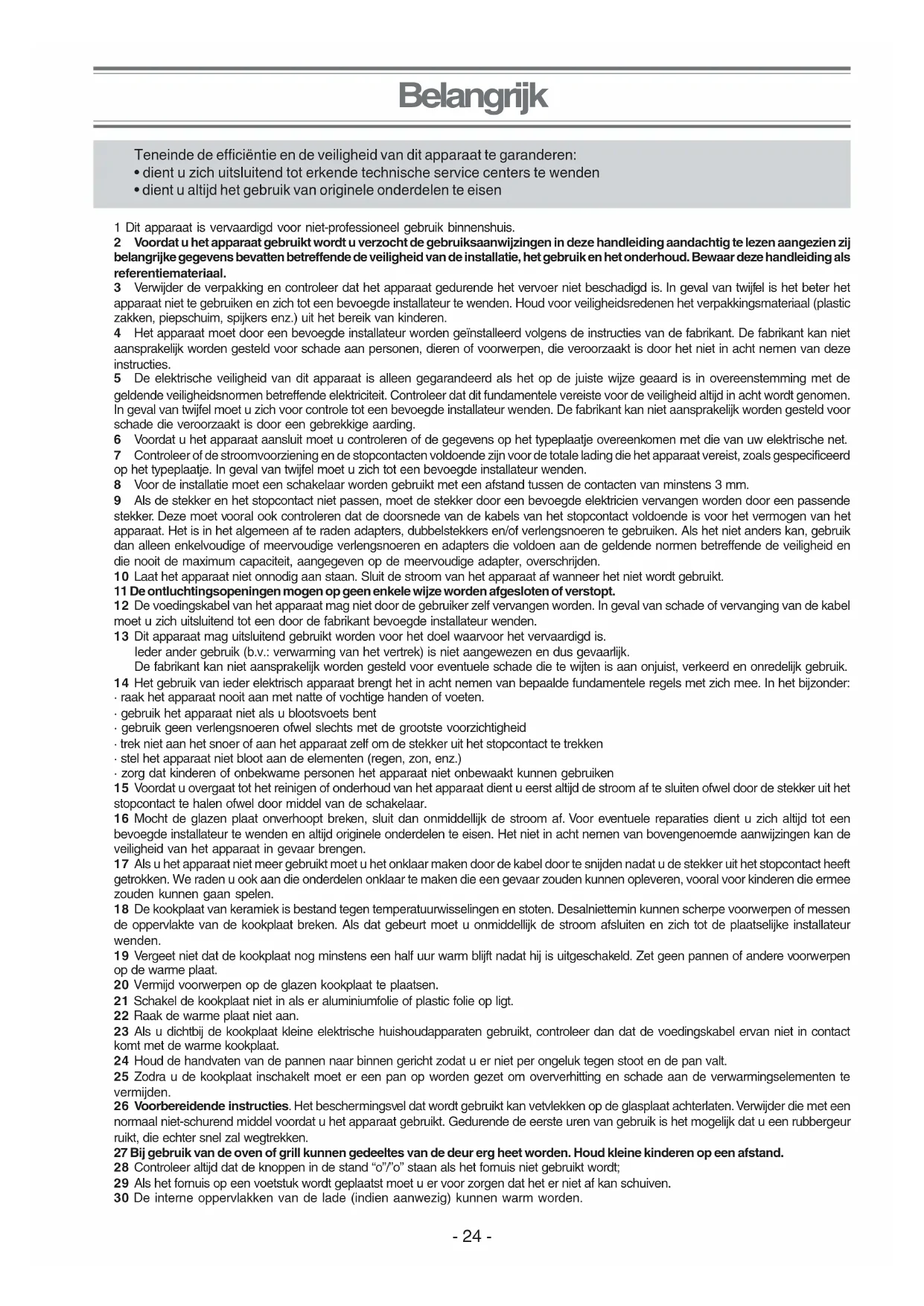 - zorg dat kinderen of onbekwame personen het apparaat niet onbewaakt kunnen gebruiken 15 Voordat u overgaat tot het reinigen of onderhoud van het apparaat dient u eerst altijd de stroom af te sluiten ofwel door de stekker uit het stopcontact te halen ofwel door middel van de schakelaar. 16 Mocht de glazen plaat onverhoopt breken, sluit dan onmiddellijk de stroom af. Voor eventuele reparaties dient u zich altijd tot een bevoegde installateur te wenden en altijd originele onderdelen te eisen. Het niet in acht nemen van bovengenoemde aanwijzingen kan de veiligheid van het apparaat in gevaar brengen. 17 Als u het apparaat niet meer gebruikt moet u het onklaar maken door de kabel door te snijden nadat u de stekker uit het stopcontact heeft getrokken. We raden u ook aan die onderdelen onklaar te maken die een gevaar zouden kunnen opleveren, vooral voor kinderen die ermee zouden kunnen gaan spelen. 18 De kookplaat van keramiek is bestand tegen temperatuurwisselingen en stoten. Desalniettemin kunnen scherpe voorwerpen of messen de oppervlakte van de kookplaat breken. Als dat gebeurt moet u onmiddellijk de stroom afsluiten en zich tot de plaatselijke installateur wenden. 19 Vergeet niet dat de kookplaat nog minstens een half uur warm blijft nadat hij is uitgeschakeld. Zet geen pannen of andere voorwerpen op de warme plaat. 20 Vermijd voorwerpen op de glazen kookplaat te plaatsen. 21 Schakel de kookplaat niet in als er aluminiumfolie of plastic folie op ligt. 22 Raak de warme plaat niet aan. 23 Als u dichtbij de kookplaat kleine elektrische huishoudapparaten gebruikt, controleer dan dat de voedingskabel ervan niet in contact komt met de warme kookplaat. 24 Houd de handvaten van de pannen naar binnen gericht zodat u er niet per ongeluk tegen stoot en de pan valt. 25 Zodra u de kookplaat inschakelt moet er een pan op worden gezet om oververhitting en schade aan de verwarmingselementen te vermijden. 26 Voorbereidende instructies. Het beschermingsvel dat wordt gebruikt kan vetvlekken op de glasplaat achterlaten. Verwijder die met een normaal niet-schurend middel voordat u het apparaat gebruikt. Gedurende de eerste uren van gebruik is het mogelijk dat u een rubbergeur ruikt, die echter snel zal wegtrekken. 27 Bij gebruik van de oven of grill kunnen gedeeltes van de deur erg heet worden. Houd kleine kinderen op een afstand. 28 Controleer altijd dat de knoppen in de stand “o”/”o” staan als het fornuis niet gebruikt wordt; 29 Als het fornuis op een voetstuk wordt geplaatst moet u er voor zorgen dat het er niet af kan schuiven. 30 De interne oppervlakken van de lade (indien aanwezig) kunnen warm worden. Teneinde de efficiëntie en de veiligheid van dit apparaat te garanderen: