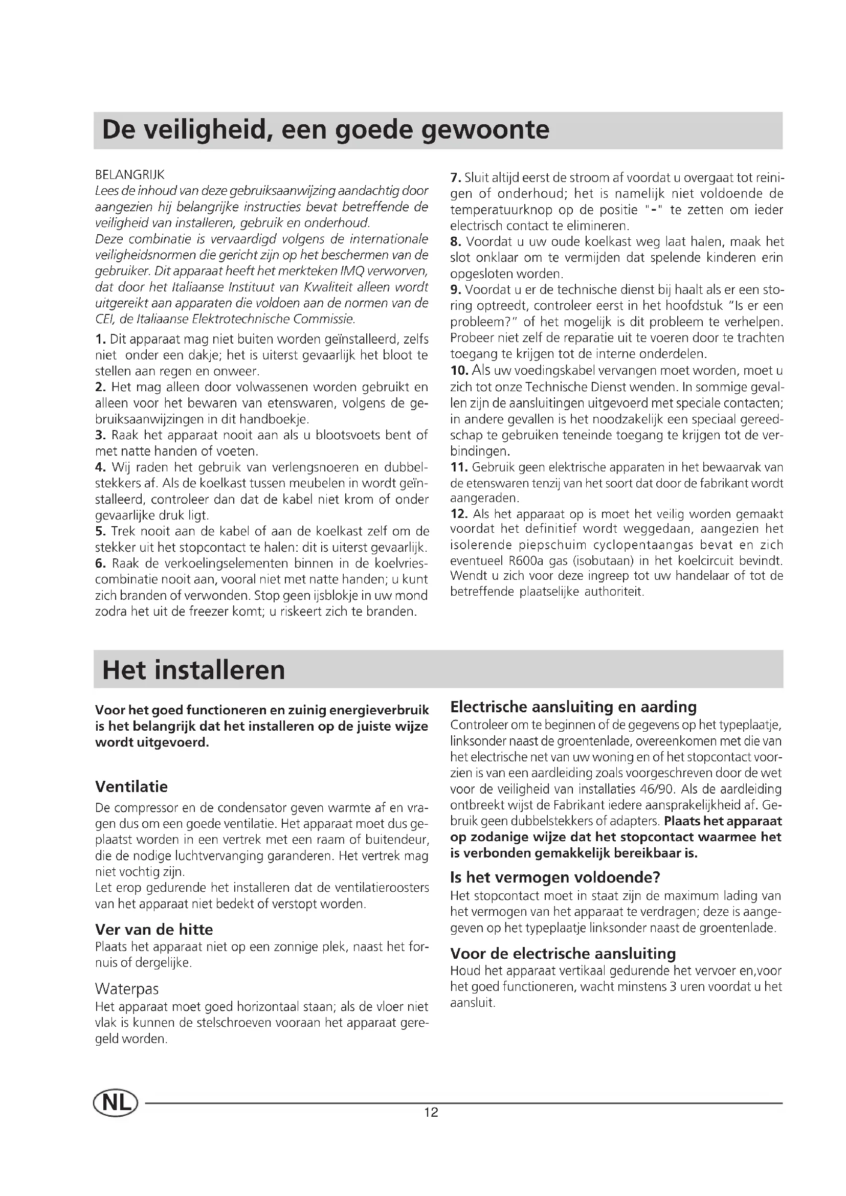 zich tot onze Technische Dienst wenden. In sommige geval- len zijn de aansluitingen uitgevoerd met speciale contacten; in andere gevallen is het noodzakelijk een speciaal gereed- schap te gebruiken teneinde toegang te krijgen tot de ver- bindingen. 11. Gebruik geen elektrische apparaten in het bewaarvak vande etenswaren tenzij van het soort dat door de fabrikant wordtaangeraden.12. Als het apparaat op is moet het veilig worden gemaaktvoordat het definitief wordt weggedaan, aangezien hetisolerende piepschuim cyclopentaangas bevat en zicheventueel R600a gas (isobutaan) in het koelcircuit bevindt.Wendt u zich voor deze ingreep tot uw handelaar of tot debetreffende plaatselijke authoriteit. BELANGRIJK Lees de inhoud van deze gebruiksaanwijzing aandachtig door aangezien hij belangrijke instructies bevat betreffende de veiligheid van installeren, gebruik en onderhoud. Deze combinatie is vervaardigd volgens de internationale veiligheidsnormen die gericht zijn op het beschermen van de gebruiker. Dit apparaat heeft het merkteken IMQ verworven, dat door het Italiaanse Instituut van Kwaliteit alleen wordt uitgereikt aan apparaten die voldoen aan de normen van de CEI, de Italiaanse Elektrotechnische Commissie. De veiligheid, een goede gewoonte