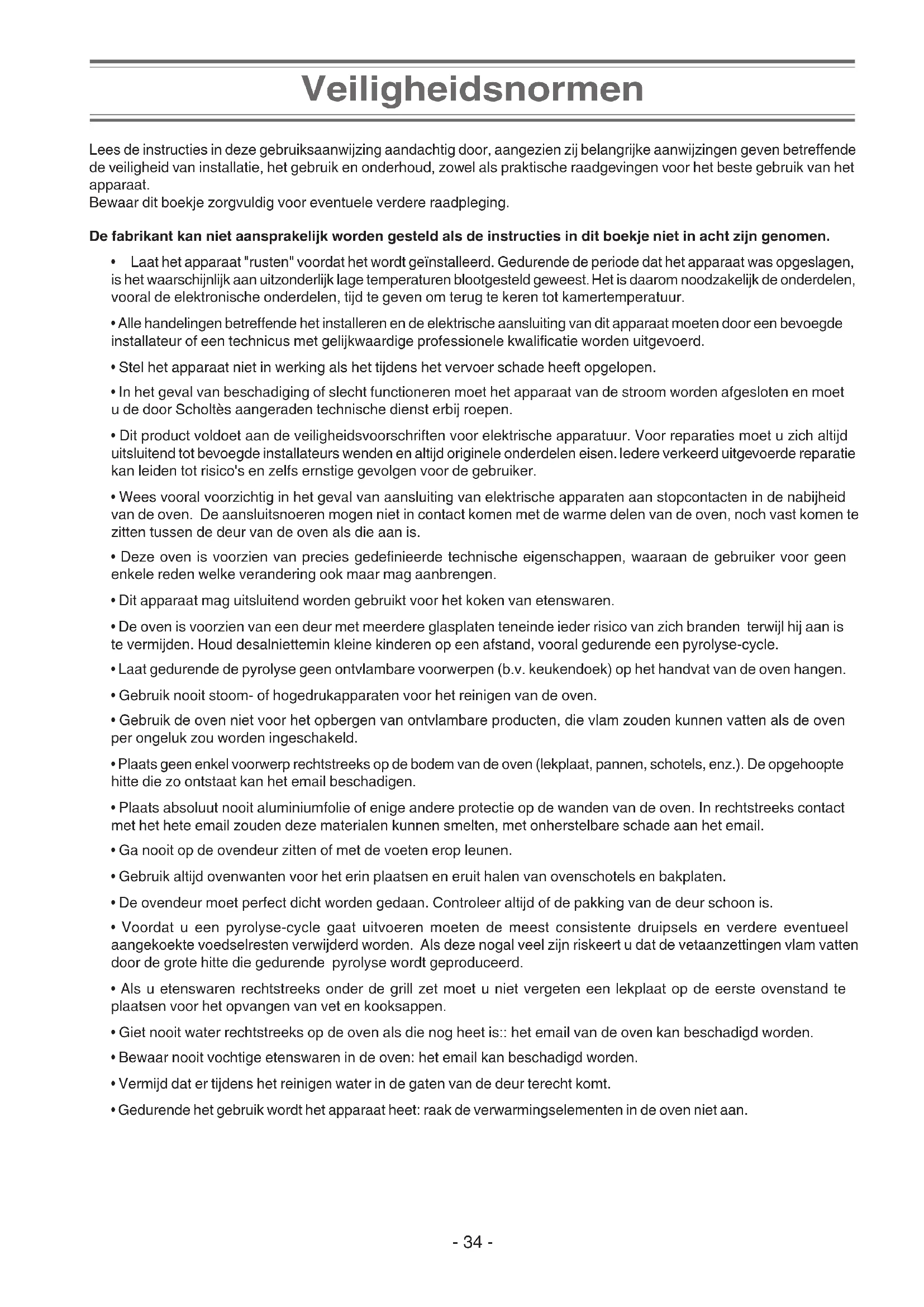 - de Gebruiksaanwijzing beschrijft op eenvoudige maar gedetailleerde wijze de functies waarvan het apparaat is voorzien. U vindt er bovendien nuttige tips voor het koken, die u helpen op de beste wijze van de mogelijkheden van de oven te genieten. Eet smakelijk met SCHOLTES- 33 - Inhoud Veiligheidsnormen ....................................................................................................................... 34 Installeren en bevestigen ............................................................................................................ 35 Installeren ................................................................................................................................................. 35 Bevestigen ................................................................................................................................................ 35 Elektrische aansluiting ................................................................................................................ 36 Technisch schema ....................................................................................................................... 37 Onderhoud van het apparaat..................................................................................................38-39 Algemene aanwijzingen............................................................................................................................ 38 Demonteren van de deur.......................................................................................................................... 38 Pakking van de ovendeur ......................................................................................................................... 38 Buitenkant van het apparaat..................................................................................................................... 38 Glazen scherm van het ovenlampje ......................................................................................................... 38 Vervangen van het lampje ........................................................................................................................ 38 De accessoires ......................................................................................................................................... 39 Het reinigen door middel van katalyse ....................................................................................... 39 Met de hand schoonmaken .........................................................................................................39 Pyrolyse ........................................................................................................................................ 40 Bescherming van het milieu........................................................................................................ 41 Onderhoud .................................................................................................................................... 41 Indice ................................................................................................................................ pagina 42- 34 - Veiligheidsnormen Lees de instructies in deze gebruiksaanwijzing aandachtig door, aangezien zij belangrijke aanwijzingen geven betreffende de veiligheid van installatie, het gebruik en onderhoud, zowel als praktische raadgevingen voor het beste gebruik van het apparaat. Bewaar dit boekje zorgvuldig voor eventuele verdere raadpleging. De fabrikant kan niet aansprakelijk worden gesteld als de instructies in dit boekje niet in acht zijn genomen.
