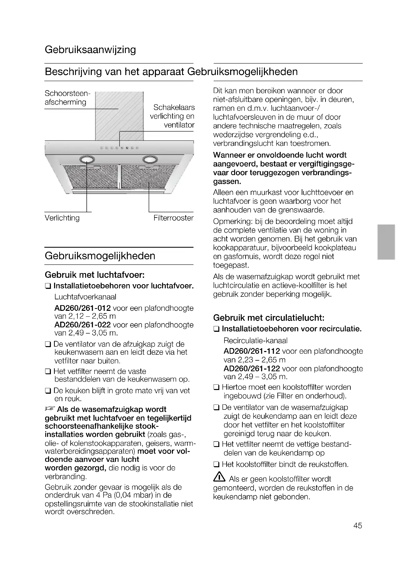 Beschrijving van het apparaat Gebruiksmogelijkheden Gebruiksmogelijkheden Gebruik met luchtafvoer: ❑ Installatietoebehoren voor luchtafvoer. Luchtafvoerkanaal AD260/261-012 voor een plafondhoogte van 2,12 – 2,65 m AD260/261-022 voor een plafondhoogte van 2,49 – 3,05 m. ❑ De ventilator van de afzuigkap zuigt de keukenwasem aan en leidt deze via het vetfilter naar buiten. ❑ Het vetfilter neemt de vaste bestanddelen van de keukenwasem op. ❑ De keuken blijft in grote mate vrij van vet en reuk.