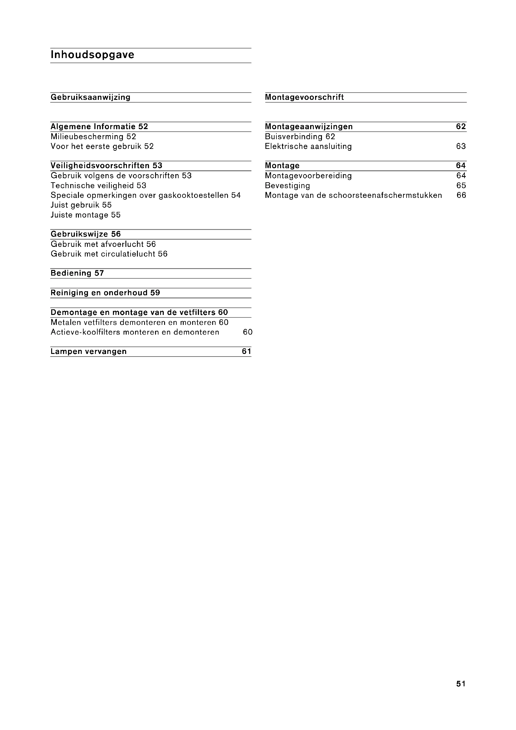 Gebruiksaanwijzing Algemene Informatie 52 Milieubescherming 52 Voor het eerste gebruik 52 Veiligheidsvoorschriften 53 Gebruik volgens de voorschriften 53 Technische veiligheid 53 Speciale opmerkingen over gaskooktoestellen 54 Juist gebruik 55 Juiste montage 55 Gebruikswijze 56 Gebruik met afvoerlucht 56 Gebruik met circulatielucht 56 Bediening 57 Reiniging en onderhoud 59 Demontage en montage van de vetfilters 60 Metalen vetfilters demonteren en monteren 60 Actieve-koolfilters monteren en demonteren 60 Lampen vervangen 61 Montagevoorschrift Montageaanwijzingen 62 Buisverbinding 62 Elektrische aansluiting 63 Montage 64 Montagevoorbereiding 64 Bevestiging 65 Montage van de schoorsteenafschermstukken 6652 Milieubescherming Recycling van de transportverpakking Uw nieuwe apparaat is op weg naar u beschermd door de verpakking. De gebruikte materialen zijn onschadelijk voor het milieu en geschikt voor recycling. Zorg a.u.b. voor een milieuvriendelijke afvoer van het verpakking. 몇 VERWONDINGSGEVAAR De verpakking kan gevaarlijk zijn voor kinderen. Bewaar deze dus buiten bereik van kinderen. Afvoeren van het oude apparaat Oude apparaten zijn geen waardeloos afval! Door een milieuvriendelijke afvoer kunnen waardevolle grondstoffen worden teruggewonnen. Dit apparaat is gekenmerkt volgens de Europese richtlijn 2002/96/EG over oude elektrische en elektronische apparaten (waste electrical and electronic equipment - WEEE). Deze richtlijn vormt het kader voor het terugnemen en de verwerking van oude apparaten binnen de gehele EU. Maak het oude apparaat onbruikbaar voordat u het afvoert. Doe het oude apparaat in geen geval bij het huisvuil! Vraag bij uw speciaalzaak of gemeente om actuele informatie over het afvoeren van afval en het oude apparaat. Zorg ervoor dat het oude apparaat buiten bereik van kinderen wordt opgeborgen voordat het wordt afgevoerd. Voor het eerste gebruik Opmerking: Deze gebruiksaanwijzing geldt voor verschillende uitvoeringen van het apparaat. Het is mogelijk dat er kenmerken worden beschreven die niet van toepassing zijn op uw apparaat. Lees de gebruiksaanwijzing zorgvuldig voordat u het nieuwe apparaat in gebruik neemt. Deze bevat belangrijke informatie voor uw veiligheid en over het gebruik en onderhoud van het apparaat. Bewaar de gebruiksaanwijzing en het installatievoorschrift en overhandig deze als u het apparaat doorgeeft aan derden. Storingen Wanneer op de indicatie een F wordt weergegeven: