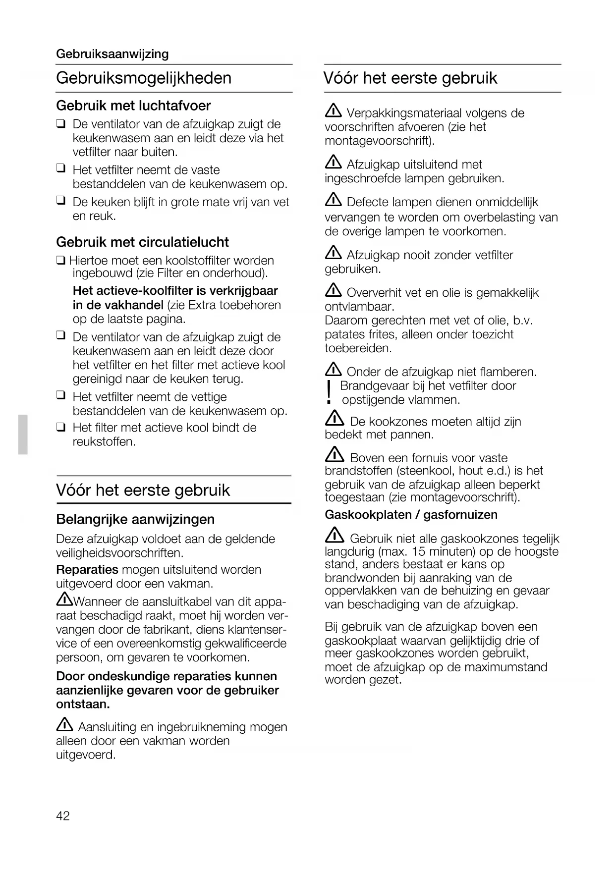 De ventilator van de afzuigkap zuigt dekeukenwasem aan en leidt deze via hetvetfilter naar buiten. Het vetfilter neemt de vaste bestanddelen van de keukenwasem op. De keuken blijft in grote mate vrij van veten reuk. Gebruik met circulatielucht ❑ Hiertoe moet een koolstoffilter wordeningebouwd (zie Filter en onderhoud).Het actieve-koolfilter is verkrijgbaarin de vakhandel (zie Extra toebehorenop de laatste pagina. De ventilator van de afzuigkap zuigt dekeukenwasem aan en leidt deze doorhet vetfilter en het filter met actieve koolgereinigd naar de keuken terug. Het vetfilter neemt de vettige bestanddelen van de keukenwasem op. Het filter met actieve kool bindt dereukstoffen. Vóór het eerste gebruik Belangrijke aanwijzingen Deze afzuigkap voldoet aan de geldendeveiligheidsvoorschriften.Reparaties mogen uitsluitend worden uitgevoerd door een vakman. Wanneer de aansluitkabel van dit appa- raat beschadigd raakt, moet hij worden ver-vangen door de fabrikant, diens klantenser-vice of een overeenkomstig gekwalificeerdepersoon, om gevaren te voorkomen.Door ondeskundige reparaties kunnenaanzienlijke gevaren voor de gebruikerontstaan. Aansluiting en ingebruikneming mogen alleen door een vakman worden uitgevoerd. Gebruiksmogelijkheden Gebruiksaanwijzing Vóór het eerste gebruik 5750.197 476.qxd 11.02.2005 7:50 Uhr Seite 4243 De keukenwasem wordt op de doeltreffendste manier verwijderd door: