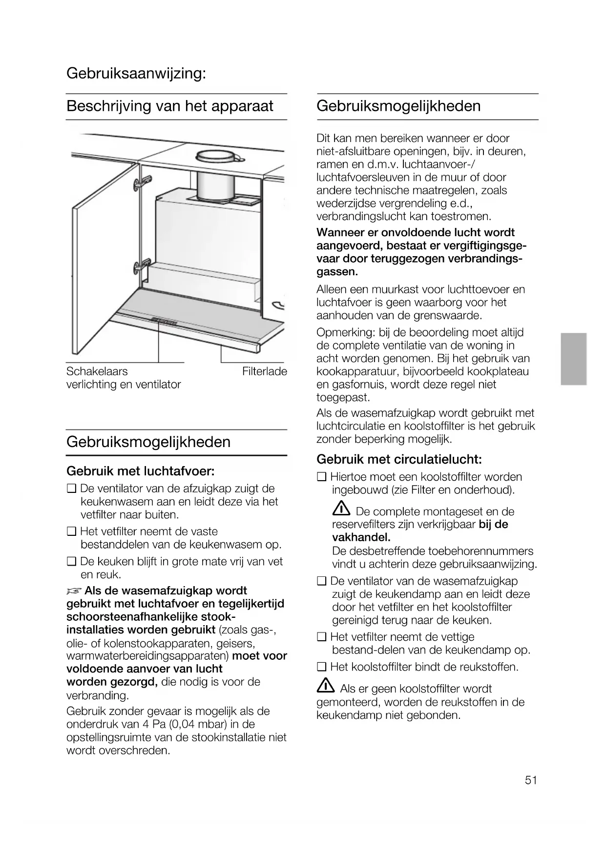 ❑ L'indicateur s'éteint au bout d'un instant.51 Gebruiksmogelijkheden Dit kan men bereiken wanneer er door niet-afsluitbare openingen, bijv. in deuren, ramen en d.m.v. luchtaanvoer-/ luchtafvoersleuven in de muur of door andere technische maatregelen, zoals wederzijdse vergrendeling e.d., verbrandingslucht kan toestromen. Wanneer er onvoldoende lucht wordt aangevoerd, bestaat er vergiftigingsge- vaar door teruggezogen verbrandings- gassen. Alleen een muurkast voor luchttoevoer en luchtafvoer is geen waarborg voor het aanhouden van de grenswaarde. Opmerking: bij de beoordeling moet altijd de complete ventilatie van de woning in acht worden genomen. Bij het gebruik van kookapparatuur, bijvoorbeeld kookplateau en gasfornuis, wordt deze regel niet toegepast. Als de wasemafzuigkap wordt gebruikt met luchtcirculatie en koolstoffilter is het gebruik zonder beperking mogelijk. Gebruik met circulatielucht: ❑ Hiertoe moet een koolstoffilter worden ingebouwd (zie Filter en onderhoud). De complete montageset en de reservefilters zijn verkrijgbaar bij de vakhandel. De desbetreffende toebehorennummers vindt u achterin deze gebruiksaanwijzing. ❑ De ventilator van de wasemafzuigkap zuigt de keukendamp aan en leidt deze door het vetfilter en het koolstoffilter gereinigd terug naar de keuken. ❑ Het vetfilter neemt de vettige bestand-delen van de keukendamp op. ❑ Het koolstoffilter bindt de reukstoffen. Als er geen koolstoffilter wordt gemonteerd, worden de reukstoffen in de keukendamp niet gebonden. Schakelaars verlichting en ventilator Filterlade Beschrijving van het apparaat Gebruiksaanwijzing: Gebruiksmogelijkheden Gebruik met luchtafvoer: ❑ De ventilator van de afzuigkap zuigt de keukenwasem aan en leidt deze via het vetfilter naar buiten. ❑ Het vetfilter neemt de vaste bestanddelen van de keukenwasem op. ❑ De keuken blijft in grote mate vrij van vet en reuk.