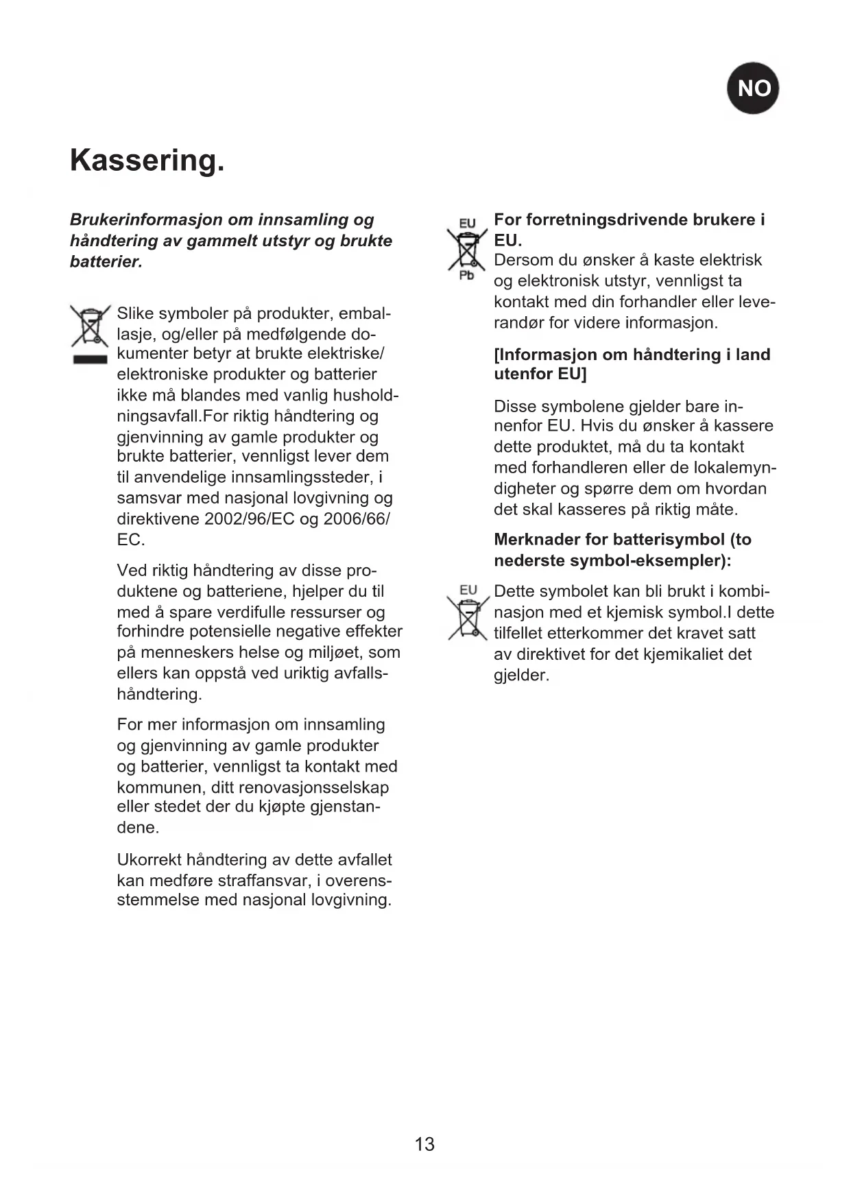 Verschroten. Informatie voor gebruikers betreffende het verzamelen en verwijderen van oude uitrustingen en lege batterijen. Deze symbolen op de producten, verpakkingen, en/of begeleidende documenten betekenen dat gebru- ikte elektrische en elektronische producten en batterijen niet met het algemene huishoudelijke afval gemengd mogen worden.Voor een correcte behandeling, recuperatie en recyclage van oude producten en lege batterijen moeten zij naar de bevoegde verzamelpunten gebracht worden in overeenstemming met uw nationale wetgeving en de Richtlijnen 2002/96/EC en 2006/66/EC. Door deze producten en batterijen correct te verwijderen draagt u uw steentje bij tot het beschermen van waardevolle middelen en tot de preventie van potentiële negatieve effecten op de gezondheid van de mens en op het milieu die anders door een onvakkundige afvalverwer- king zouden kunnen ontstaan. Voor meer informatie over het verzamelen en recycleren van oude producten en batterijen, gelieve contact op te nemen met uw plaat- selijke gemeente, uw afvalverwijde- ringsdiensten of de winkel waar u de goederen gekocht hebt. Voor een niet-correcte verwijdering van dit afval kunnen boetes opgelegd worden in overeenstemming met de nationale wetgeving. VoorzakengebruikersindeEuro- peseUnie Indien u elektrische en elektronische uitrusting wilt vewijderen, neem dan contact op met uw dealer voor meer informatie. [Informatieoverdeverwijderingin anderelandenbuitendeEuropese Unie] Deze symbolen zijn enkel geldig in de Europese Unie. Neem wanneer u dit product wilt weggooien, contact op met de lokale overheid of uw leverancier en vraag wat de juistever- wijderingsmethode is. Opmerkingoverhetbatterijensym- bool(benedentweevoorbeelden): Dit symbool kan gebruikt worden in verbinding met een chemisch symbool. In dat geval wordt de eis, vastgelegd door de Richtlijn voor de betrokken chemische producten vervuld.0-9193120-02 UK Reserving the right to alter specications without prior notice. DE Recht auf Änderungen vorbehalten. FR Nous nous réservons le droit d’apporter toutes modications à nos produits DK Ret til ændringer forbeholdes NO Rett til endringer forbeholdes NL Recht tot wijzigingen voorbehouden