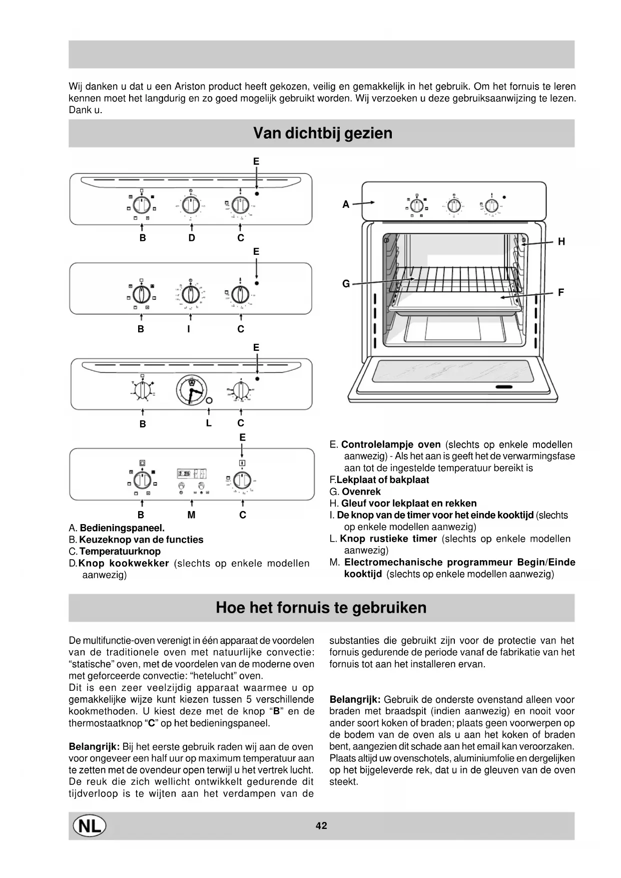 Hoe het fornuis te gebruiken De multifunctie-oven verenigt in één apparaat de voordelen van de traditionele oven met natuurlijke convectie: “statische” oven, met de voordelen van de moderne oven met geforceerde convectie: “hetelucht” oven. Dit is een zeer veelzijdig apparaat waarmee u op gemakkelijke wijze kunt kiezen tussen 5 verschillende kookmethoden. U kiest deze met de knop “B” en de thermostaatknop “C” op het bedieningspaneel. Belangrijk: Bij het eerste gebruik raden wij aan de oven voor ongeveer een half uur op maximum temperatuur aan te zetten met de ovendeur open terwijl u het vertrek lucht. De reuk die zich wellicht ontwikkelt gedurende dit tijdverloop is te wijten aan het verdampen van de substanties die gebruikt zijn voor de protectie van het fornuis gedurende de periode vanaf de fabrikatie van het fornuis tot aan het installeren ervan. Belangrijk: Gebruik de onderste ovenstand alleen voor braden met braadspit (indien aanwezig) en nooit voor ander soort koken of braden; plaats geen voorwerpen op de bodem van de oven als u aan het koken of braden bent, aangezien dit schade aan het email kan veroorzaken. Plaats altijd uw ovenschotels, aluminiumfolie en dergelijken op het bijgeleverde rek, dat u in de gleuven van de oven steekt. E. Controlelampje oven (slechts op enkele modellen aanwezig) - Als het aan is geeft het de verwarmingsfase aan tot de ingestelde temperatuur bereikt is F. Lekplaat of bakplaat G. Ovenrek H. Gleuf voor lekplaat en rekken