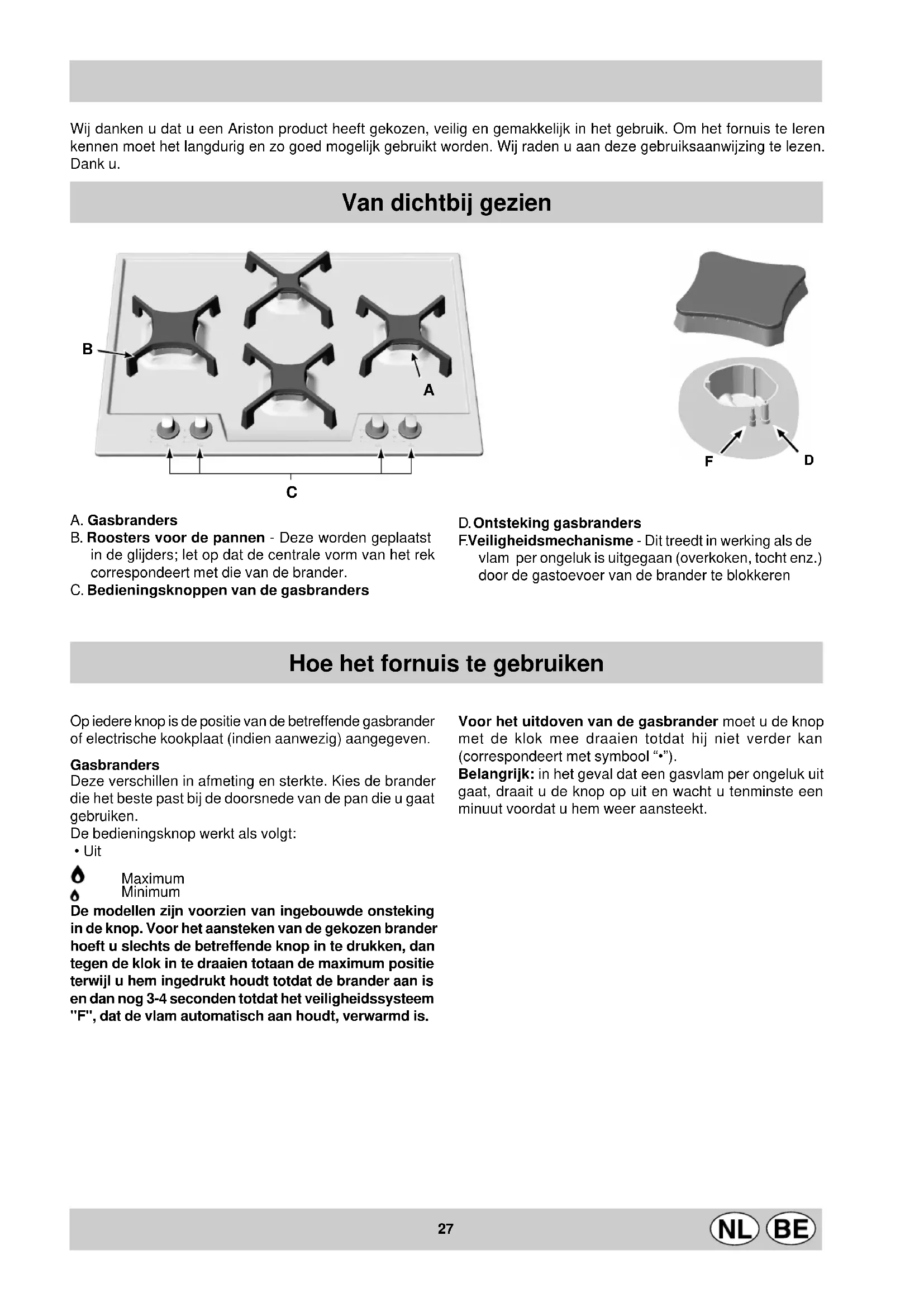 - Uit Maximum Minimum De modellen zijn voorzien van ingebouwde onsteking in de knop. Voor het aansteken van de gekozen brander hoeft u slechts de betreffende knop in te drukken, dan tegen de klok in te draaien totaan de maximum positie terwijl u hem ingedrukt houdt totdat de brander aan is en dan nog 3-4 seconden totdat het veiligheidssysteem "F", dat de vlam automatisch aan houdt, verwarmd is. Hoe het fornuis te gebruiken