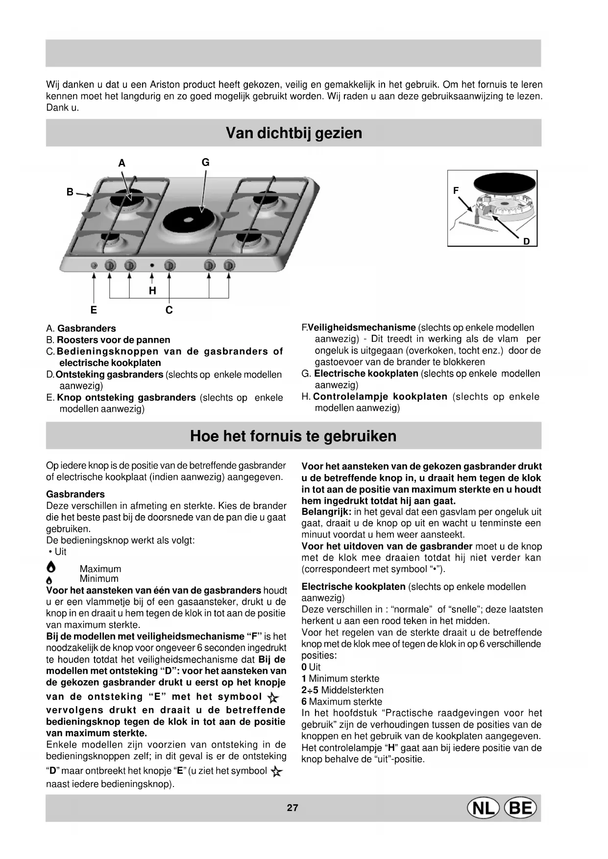 (1) Voir la plaquette d'immatriculation de l'appareil. Cet appareil est conforme aux Directives Communautaires suivantes: - 73/23/CEE du 19/02/73 (Basse Tension) et modifications successives; - 89/336/CEE du 03/05/89 (Compatibilité électromagnétique) et modifications successives; - 90/396/CEE du 29/06/90 (Gaz) et modifications successives; - 93/68/CEE du 22/07/93 et modifications successives.27 Wij danken u dat u een Ariston product heeft gekozen, veilig en gemakkelijk in het gebruik. Om het fornuis te leren kennen moet het langdurig en zo goed mogelijk gebruikt worden. Wij raden u aan deze gebruiksaanwijzing te lezen. Dank u. A. Gasbranders B. Roosters voor de pannen C. Bedieningsknoppen van de gasbranders of electrische kookplaten D. Ontsteking gasbranders (slechts op enkele modellen aanwezig) E. Knop ontsteking gasbranders (slechts op enkele modellen aanwezig) F. Veiligheidsmechanisme (slechts op enkele modellen aanwezig) - Dit treedt in werking als de vlam per ongeluk is uitgegaan (overkoken, tocht enz.) door de gastoevoer van de brander te blokkeren G. Electrische kookplaten (slechts op enkele modellen aanwezig) H. Controlelampje kookplaten (slechts op enkele modellen aanwezig) Van dichtbij gezien Op iedere knop is de positie van de betreffende gasbrander of electrische kookplaat (indien aanwezig) aangegeven. Gasbranders Deze verschillen in afmeting en sterkte. Kies de brander die het beste past bij de doorsnede van de pan die u gaat gebruiken. De bedieningsknop werkt als volgt:
