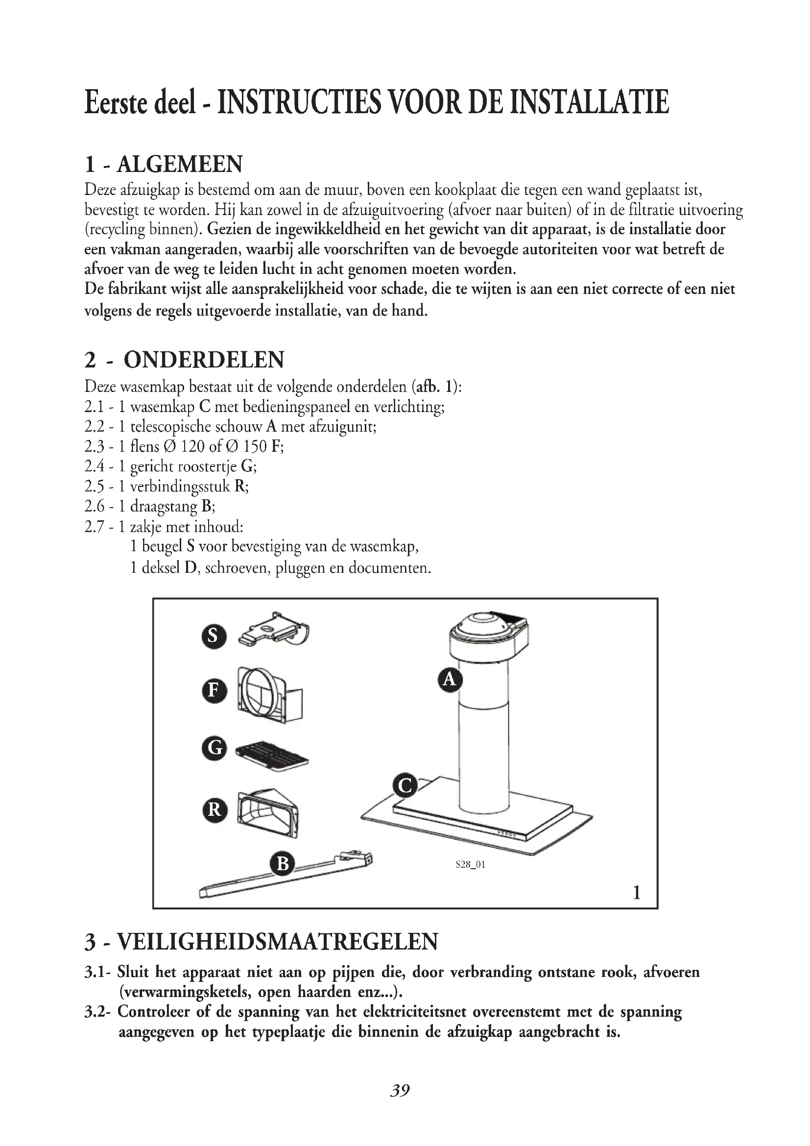 Deze afzuigkap is bestemd om aan de muur, boven een kookplaat die tegen een wand geplaatst ist, bevestigt te worden. Hij kan zowel in de afzuiguitvoering (afvoer naar buiten) of in de filtratie uitvoering (recycling binnen). Gezien de ingewikkeldheid en het gewicht van dit apparaat, is de installatie door een vakman aangeraden, waarbij alle voorschriften van de bevoegde autoriteiten voor wat betreft de afvoer van de weg te leiden lucht in acht genomen moeten worden. De fabrikant wijst alle aansprakelijkheid voor schade, die te wijten is aan een niet correcte of een niet volgens de regels uitgevoerde installatie, van de hand.