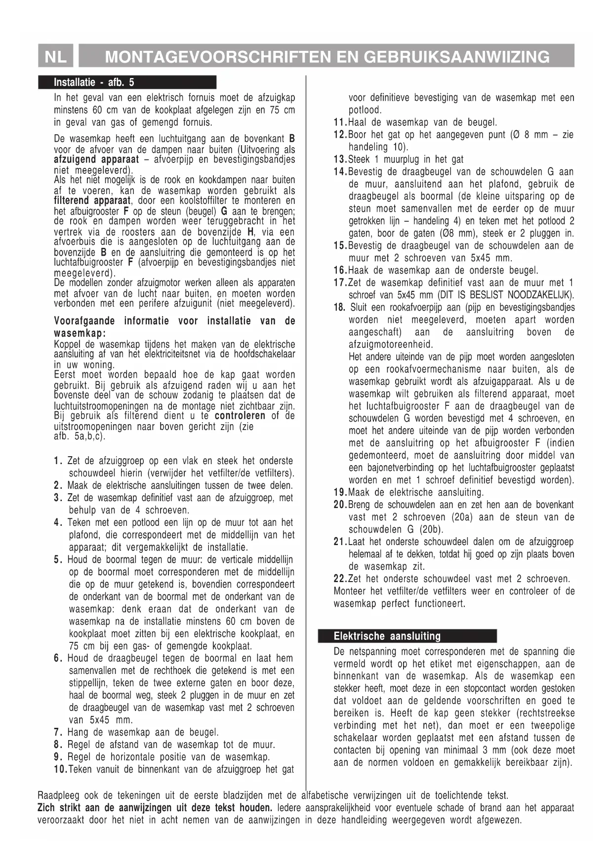 worden niet meegeleverd, moeten apart worden aangeschaft) aan de aansluitring boven de afzuigmotoreenheid. Het andere uiteinde van de pijp moet worden aangesloten op een rookafvoermechanisme naar buiten, als de wasemkap gebruikt wordt als afzuigapparaat. Als u de wasemkap wilt gebruiken als filterend apparaat, moet het luchtafbuigrooster F aan de draagbeugel van de schouwdelen G worden bevestigd met 4 schroeven, en moet het andere uiteinde van de pijp worden verbonden met de aansluitring op het afbuigrooster F (indien gedemonteerd, moet de aansluitring door middel van een bajonetverbinding op het luchtafbuigrooster geplaatst worden en met 1 schroef definitief bevestigd worden). 19.Maak de elektrische aansluiting. 20.Breng de schouwdelen aan en zet hen aan de bovenkant vast met 2 schroeven (20a) aan de steun van de schouwdelen G (20b). 21.Laat het onderste schouwdeel dalen om de afzuiggroep helemaal af te dekken, totdat hij goed op zijn plaats boven de wasemkap zit. 22.Zet het onderste schouwdeel vast met 2 schroeven. Monteer het vetfilter/de vetfilters weer en controleer of de wasemkap perfect functioneert. Elektrische aansluiting De netspanning moet corresponderen met de spanning die vermeld wordt op het etiket met eigenschappen, aan de binnenkant van de wasemkap. Als de wasemkap een stekker heeft, moet deze in een stopcontact worden gestoken dat voldoet aan de geldende voorschriften en goed te bereiken is. Heeft de kap geen stekker (rechtstreekse verbinding met het net), dan moet er een tweepolige schakelaar worden geplaatst met een afstand tussen de contacten bij opening van minimaal 3 mm (ook deze moet aan de normen voldoen en gemakkelijk bereikbaar zijn).