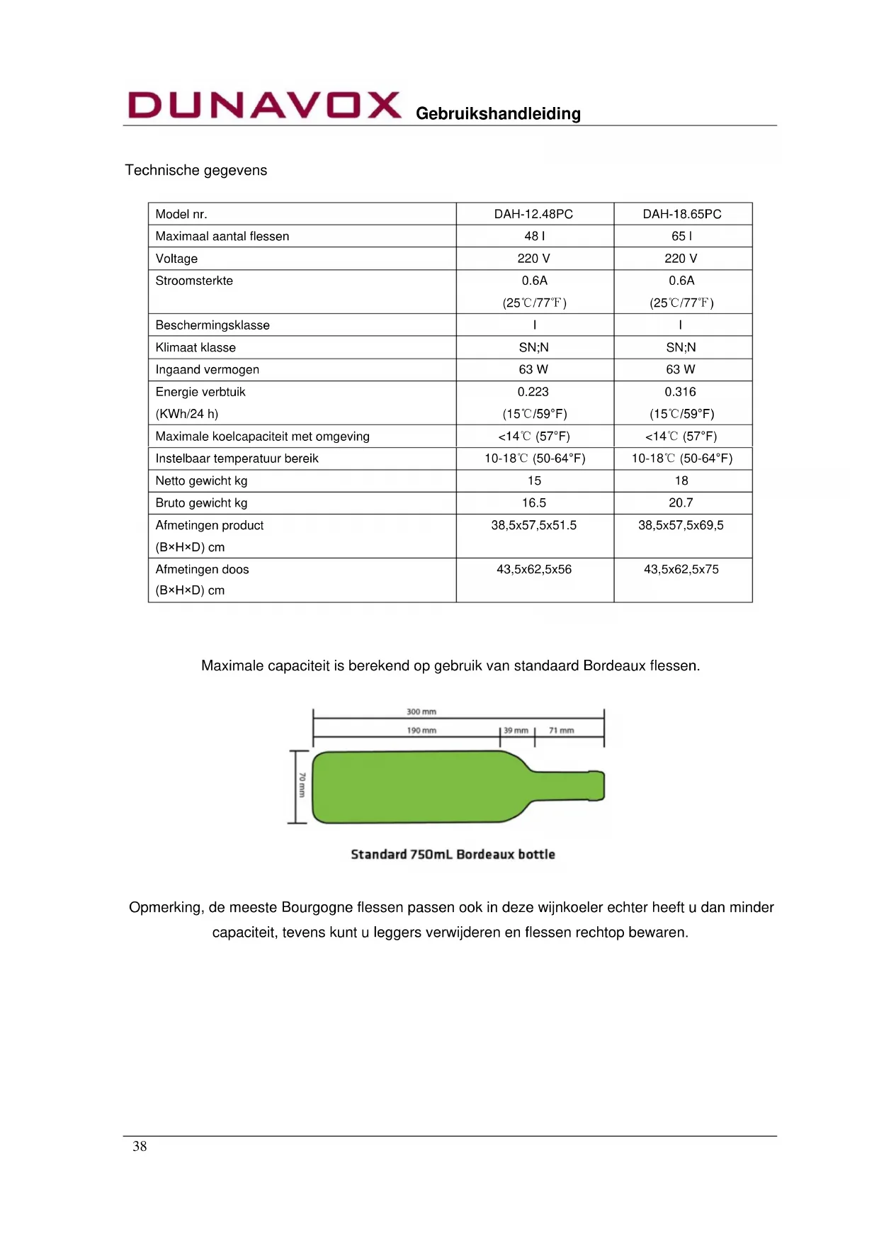 Maximale capaciteit is berekend op gebruik van standaard Bordeaux flessen. Opmerking, de meeste Bourgogne flessen passen ook in deze wijnkoeler echter heeft u dan minder capaciteit, tevens kunt u leggers verwijderen en flessen rechtop bewaren. Model nr. DAH-12.48PC DAH-18.65PC Maximaal aantal flessen 48 l 65 l Voltage 220 V 220 V Stroomsterkte 0.6A (25℃/77℉) 0.6A (25℃/77℉) Beschermingsklasse