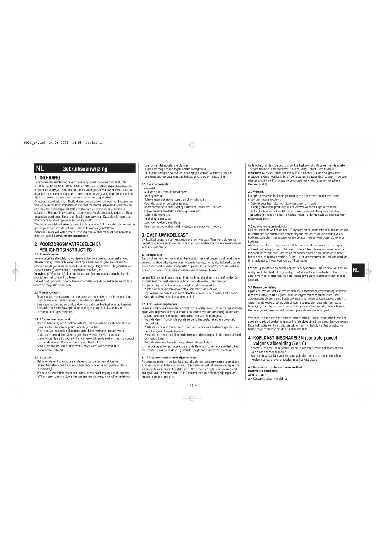 6071_BW.qxd 24-06-2005 14:58 Pagina 100FOREWORD 1 INLEIDING Deze gebruikershandleiding is van toepassing op de modellen N80, N90, N97,N100, N104, N109, N110, N112, N145 en N150 van Thetford absorptiekoelkastenen dient als wegwijzer, voor het correct en veilig gebruik van uw koelkast. Leest udeze gebruikershandleiding voor het eerste gebruik zorgvuldig door om in een kortetijd te ontdekken hoe u uw koelkast moet bedienen en gebruiken.De absorptiekoelkasten van Thetford zijn speciaal ontwikkeld voor het bewaren vanvers en bevroren levensmiddelen en voor het maken van ijsblokjes in caravans encampers. Het gebruikspaneel stelt u in staat om de gewenste energiebron teselecteren. Hierdoor is uw koelkast onder verschillende omstandigheden bruikbaar.In de tekst wordt met cijfers naar afbeeldingen verwezen. Deze afbeeldingen staanvoorin deze handleiding op een uitklap afgebeeld.Thetford absorptiekoelkasten behoren tot de categorie C11: toestellen die werken opgas en geïsoleerd van de leefruimte dienen te worden geïnstalleerd.Wanneer u meer wilt weten over de werking van uw absorptiekoelkast, bezoekt udan onze website www.thetford-europe.com. 2 VOORZORGSMAATREGELEN EN VEILIGHEIDSINSTRUCTIES