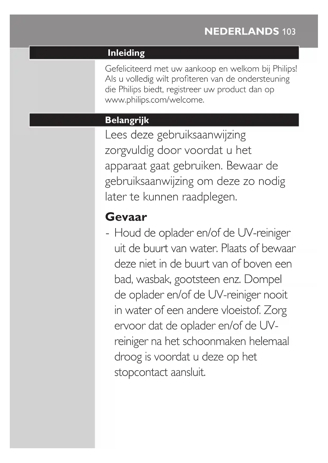 Wikkel het overtollige netsnoer om de grijze opladervoet, zoals op het plaatje is aangegeven. Zorg dat u het snoer binnen de twee kliksluitingen wikkelt. Leid het netsnoer door de kleine inkeping in de achterkant van de opladervoet. 3 Plaats de kap weer op de opladervoet door hem erop te drukken tot hij vastklikt. Tip: Voor extra gemak op reis kunt u de reisoplader verwijderen en deze zonder opladerkap en opladervoet gebruiken. UV-reinigen (alleen bepaalde typen) - Met de UV-reiniger kunt u uw opzetborstel na elke poetsbeurt reinigen. Trek de stekker van de UV-reiniger uit het stopcontact, gebruik deze niet langer en bel Consumer Care wanneer: - De UV-lamp blijft branden als het deurtje open staat. - Het venster van de UV-reiniger is beschadigd of ontbreekt. - Er rook uit de UV-reiniger komt of de UV-reiniger een brandlucht verspreid wanneer deze in werking is. nEDErlanDS 117Opmerking: UV-licht kan schade aan ogen en huid veroorzaken. Houd de UV-reiniger altijd buiten het bereik van kinderen. 1 Spoel de opzetborstel na het poetsen schoon en schud het overtollige water eraf. Plaats tijdens het UV-reinigen nooit het beschermkapje op de opzetborstel. 2 Plaats uw vinger in de uitsparing van het deurtje aan de bovenkant van de UV-reiniger en trek het deurtje open. 3 Plaats de opzetborstel op een van de 2 pinnen in de UV-reiniger met de borstelharen in de richting van de lamp. Opmerking: Gebruik de UV-reiniger alleen voor het schoonmaken van Sonicare-opzetborstels. Opmerking: Gebruik de UV-reiniger niet voor het schoonmaken van Sonicare For Kids-opzetborstels. 4 Steek de stekker in een stopcontact. 5 Sluit het deurtje en druk één keer op de groene aan/uitknop om de UV-reinigingscyclus te selecteren. Opmerking: U kunt de UV-reiniger alleen inschakelen als het deurtje volledig is gesloten. nEDErlanDS118119 Opmerking: De UV-reiniger stopt als u het deurtje tijdens de reinigingscyclus opent. Opmerking: De UV-reiniger werkt 10 minuten en schakelt dan automatisch uit. , De UV-reiniger is in werking wanneer het licht door het venster schijnt. Schoonmaken Reinig de opzetborstel, het handvat, de reisoplader, de opladerkap en de UV-reiniger niet in de vaatwasmachine. Handvat van tandenborstel 1 Verwijder de opzetborstel en spoel de metalen aandrijfas af met warm water. Gebruik geen scherpe voorwerpen om op de rubberen afdichting op de metalen aandrijfas te duwen, omdat dit schade kan veroorzaken. 2 Maak het gehele oppervlak van het handvat schoon met een vochtige doek. Opzetborstel 1 Spoel de borstel en de borstelharen na iedere poetsbeurt onder de kraan af. 2 Verwijder minimaal één keer per week de opzetborstel van het handvat en spoel het aansluitpunt van de borstel met warm water schoon. NEDERLANDSLuxe oplader (alleen bepaalde typen) 1 Trek de oplader uit het stopcontact en verwijder de opladerkap. 2 Maak het oppervlak van de oplader en de opladerkap schoon met een vochtige doek. UV-reiniger (alleen bepaalde typen) Dompel de UV-reiniger niet in water en spoel het ook niet af onder de kraan. Maak de UV-reiniger nooit schoon wanneer de UV-lamp heet is. Voor een optimale werking van de UV-reiniger raden wij u aan deze wekelijks schoon te maken. 1 Haal de stekker van de UV-reiniger uit het stopcontact. 2 Trek de lekbak recht naar buiten. Spoel de lekbak af en veeg deze schoon met een vochtige doek. 3 Maak alle oppervlakken aan de binnenkant schoon met een vochtige doek. 4 Verwijder het afdekscherm dat zich voor de UV-lamp bevindt. U verwijdert het scherm door de randjes naast de vergrendelingen beet te pakken, zachtjes te knijpen en het afdekscherm dan naar buiten te trekken. 5 Verwijder de UV-lamp. Verwijder de lamp door deze vast te pakken en uit de metalen klem te trekken. 6 Maak het afdekscherm en de UV-lamp schoon met een vochtige doek. nEDErlanDS1207 Plaats de UV-lamp terug. Plaats de lamp terug door de onderkant op gelijke hoogte te houden met de metalen klem en de lamp in de klem te drukken. 8 Plaats het afdekscherm terug. Om het afdekscherm terug te plaatsen, houdt u de pinnen van het scherm op gelijke hoogte met de openingen in het reectievlak naast de UV-lamp. Duw het scherm recht in de openingen van de UV-reiniger. Opbergen Gaat u het apparaat langere tijd niet gebruiken, haal dan de stekker uit het stopcontact. Maak het apparaat vervolgens schoon en bewaar het op een koele en droge plaats buiten direct zonlicht. U kunt de snoerwikkelaar gebruiken om het netsnoer netjes op te bergen. Vervangen Opzetborstel Vervang de Sonicare-opzetborstels om de 3 maanden voor optimale resultaten. Gebruik alleen originele Philips Sonicare- opzetborstels die geschikt zijn voor dit model. UV-lamp Vervangende UV-lampen zijn verkrijgbaar via het Philips Consumer Care Centre in uw land. NEDERLANDS 121Accessoires bestellen Ga naar www.shop.philips.com/service om accessoires en reserveonderdelen te kopen of ga naar uw Philips-dealer. U kunt ook contact opnemen met het Philips Consumer Care Centre in uw land (zie het ‘worldwide guarantee’-vouwblad voor contactgegevens). Milieu - Gooi het apparaat en de UV-lamp (de lamp bevat kwik) aan het einde van de levensduur niet weg met het normale huisvuil, maar lever ze in op een door de overheid aangewezen inzamelpunt om ze te laten recyclen. Op die manier levert u een bijdrage aan een schonere leefomgeving. - De ingebouwde accu van de Sonicare bevat stoffen die schadelijk kunnen zijn voor het milieu. Verwijder altijd de accu voordat u het apparaat afdankt en inlevert op een door de overheid aangewezen inzamelpunt. Lever de accu in op een ofcieel inzamelpunt voor batterijen. Als u problemen ondervindt bij het verwijderen van de accu, kunt u met het apparaat ook naar een Philips-servicecentrum gaan. Medewerkers van dit centrum verwijderen dan de accu voor u en zorgen ervoor dat deze op milieuvriendelijke wijze wordt verwerkt. nEDErlanDS122De accu verwijderen U kunt de accu niet opnieuw in het apparaat plaatsen nadat u deze hebt verwijderd. Om de accu te verwijderen, he