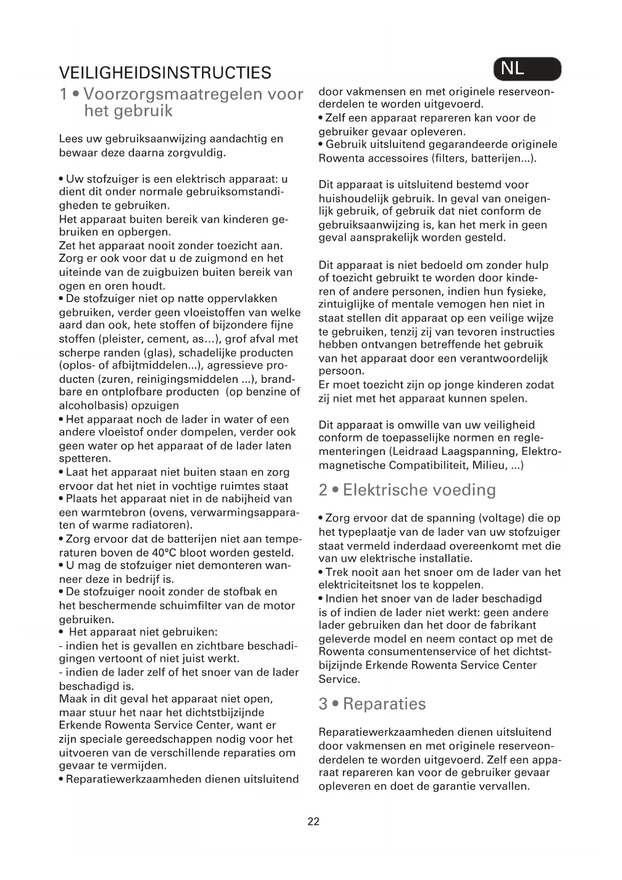 - Indien het snoer van de lader beschadigd is of indien de lader niet werkt: geen andere lader gebruiken dan het door de fabrikant geleverde model en neem contact op met de Rowenta consumentenservice of het dichtst- bijzijnde Erkende Rowenta Service Center Service. 3 • Reparaties Reparatiewerkzaamheden dienen uitsluitend door vakmensen en met originele reserveon- derdelen te worden uitgevoerd. Zelf een appa- raat repareren kan voor de gebruiker gevaar opleveren en doet de garantie vervallen. VEILIGHEIDSINSTRUCTIES22 23