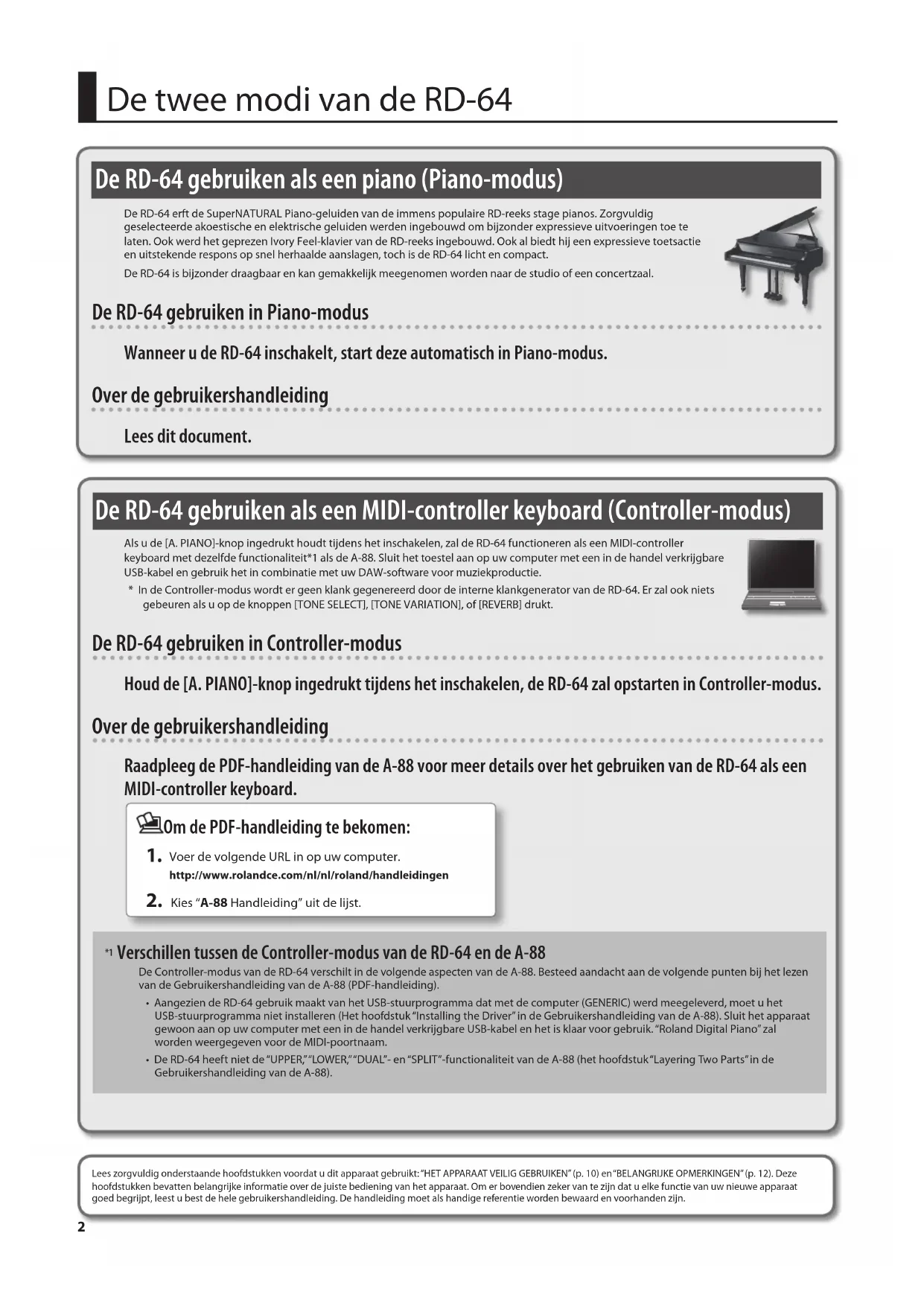 - In de Controller-modus wordt er geen klank gegenereerd door de interne klankgenerator van de RD-64. Er zal ook niets gebeuren als u op de knoppen [TONE SELECT], [TONE VARIATION], of [REVERB] drukt. De RD-64 gebruiken in Controller-modus Houd de [A. PIANO]-knop ingedrukt tijdens het inschakelen, de RD-64 zal opstarten in Controller-modus. Over de gebruikershandleiding Raadpleeg de PDF-handleiding van de A-88 voor meer details over het gebruiken van de RD-64 als een MIDI-controller keyboard. Om de PDF-handleiding te bekomen: