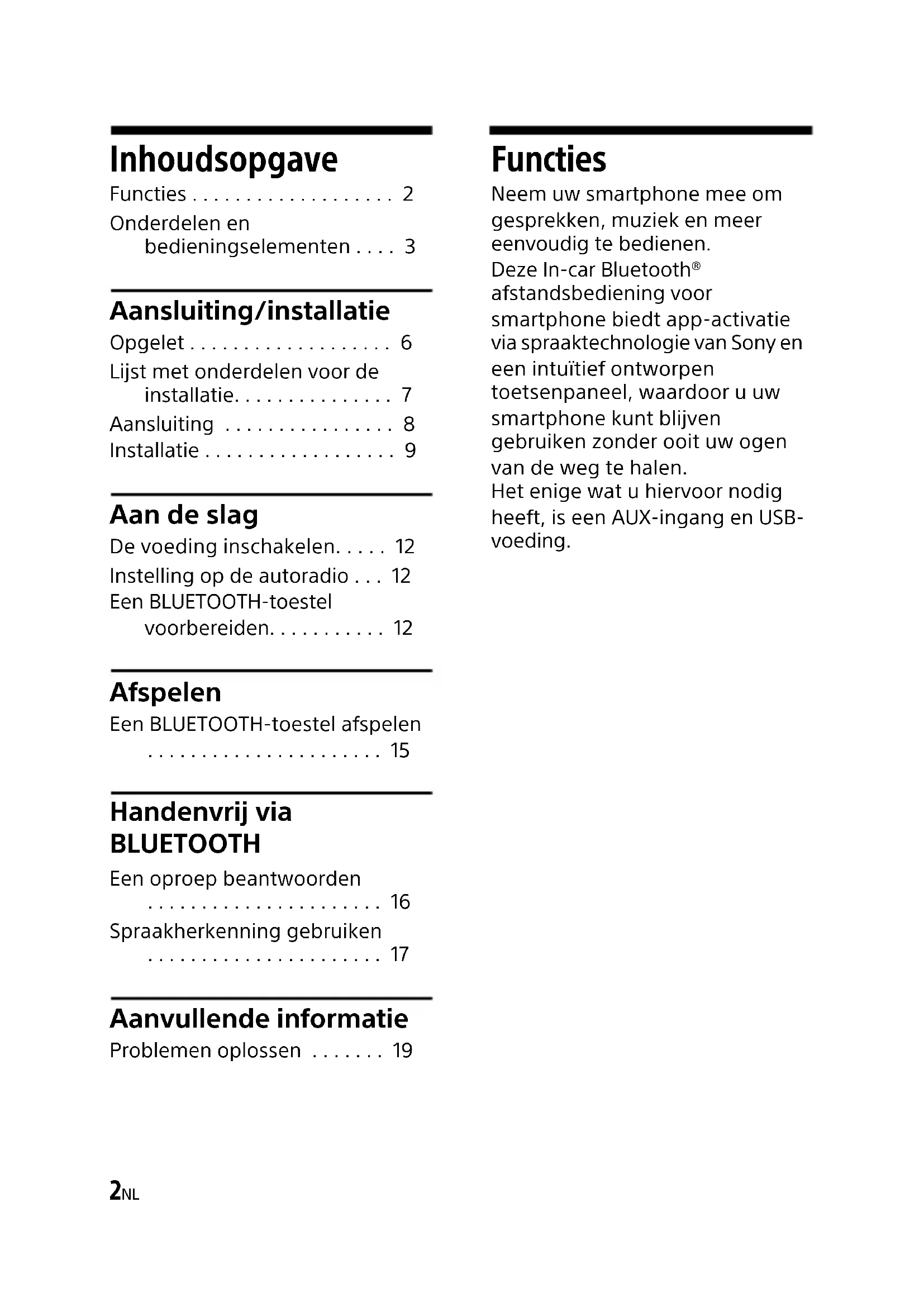 Aanvullende informatie Problemen oplossen . . . . . . . 19 Functies Neem uw smartphone mee om gesprekken, muziek en meer eenvoudig te bedienen. Deze In-car Bluetooth® afstandsbediening voor smartphone biedt app-activatie via spraaktechnologie van Sony en een intuïtief ontworpen toetsenpaneel, waardoor u uw smartphone kunt blijven gebruiken zonder ooit uw ogen van de weg te halen. Het enige wat u hiervoor nodig heeft, is een AUX-ingang en USB- voeding.3NL Onderdelen en bedieningselementen MODE Schakelt tussen de volumestand en de zoomstand. PAIRING Houd gedurende 2 seconden ingedrukt om de koppeling tot stand te brengen. Houd gedurende 7 seconden ingedrukt om een reset van de koppelingshistorie en de MODE-instelling van de adapter uit te voeren. ZOOM/VOL-indicatielampje (volume) (wit) Licht op bij het selecteren van de zoomstand. Knippert 4 maal bij het voltooien van de reset van de adapter. Ontvanger voor de afstandsbediening -indicatielampje (blauw) Knippert snel in de stand- bystand voor koppeling. Knippert langzaam in de stand-bystand voor BLUETOOTH. Blijft branden tijdens een verbinding via BLUETOOTH. MIC (microfoon) Ingebouwde microfoon. Deze is niet beschikbaar wanneer de externe microfoon geïnstalleerd is. AUDIO OUT-ingang Hiermee kunt u met behulp van een AUX-kabel een aansluiting met de autoradio tot stand brengen. Adapter4NL USB-poort Hiermee voorziet u de adapter van voeding. MIC-IN-ingang (microfooningang) Hier installeert u de externe microfoon.5NL