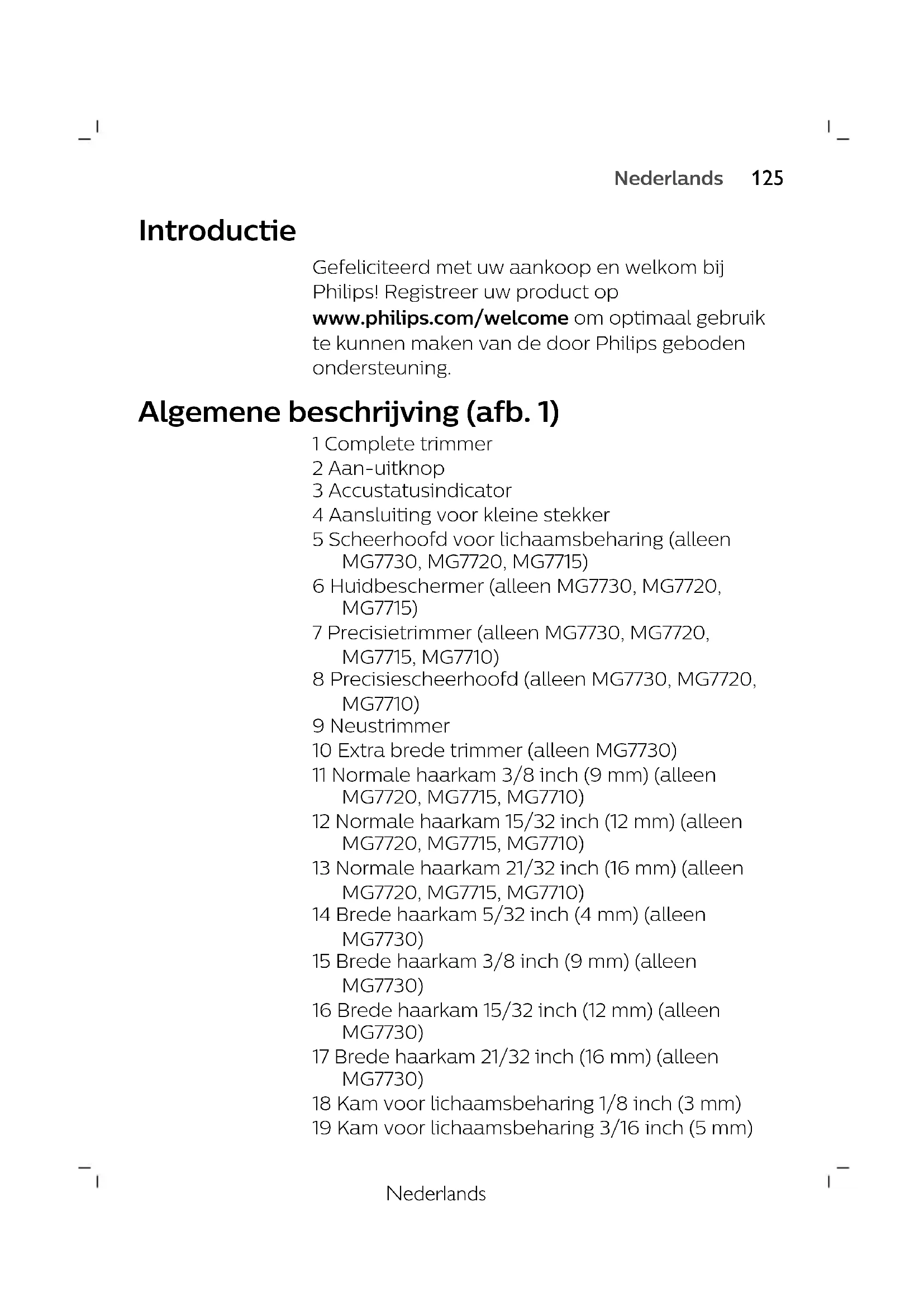 ItalianoNederlands Introductie Gefeliciteerd met uw aankoop en welkom bij Philips! Registreer uw product op www.philips.com/welcome om optimaal gebruik te kunnen maken van de door Philips geboden ondersteuning. Algemene beschrijving (afb. 1) 1 Complete trimmer 2 Aan-uitknop 3 Accustatusindicator 4 Aansluiting voor kleine stekker 5 Scheerhoofd voor lichaamsbeharing (alleen MG7730, MG7720, MG7715) 6 Huidbeschermer (alleen MG7730, MG7720, MG7715) 7 Precisietrimmer (alleen MG7730, MG7720, MG7715, MG7710) 8 Precisiescheerhoofd (alleen MG7730, MG7720, MG7710) 9 Neustrimmer 10 Extra brede trimmer (alleen MG7730) 11 Normale haarkam 3/8 inch (9 mm) (alleen MG7720, MG7715, MG7710) 12 Normale haarkam 15/32 inch (12 mm) (alleen MG7720, MG7715, MG7710) 13 Normale haarkam 21/32 inch (16 mm) (alleen MG7720, MG7715, MG7710) 14 Brede haarkam 5/32 inch (4mm) (alleen MG7730) 15 Brede haarkam 3/8 inch (9 mm) (alleen MG7730) 16 Brede haarkam 15/32 inch (12 mm) (alleen MG7730) 17 Brede haarkam 21/32 inch (16 mm) (alleen MG7730) 18 Kam voor lichaamsbeharing 1/8inch (3 mm) 19 Kam voor lichaamsbeharing 3/16inch (5 mm)