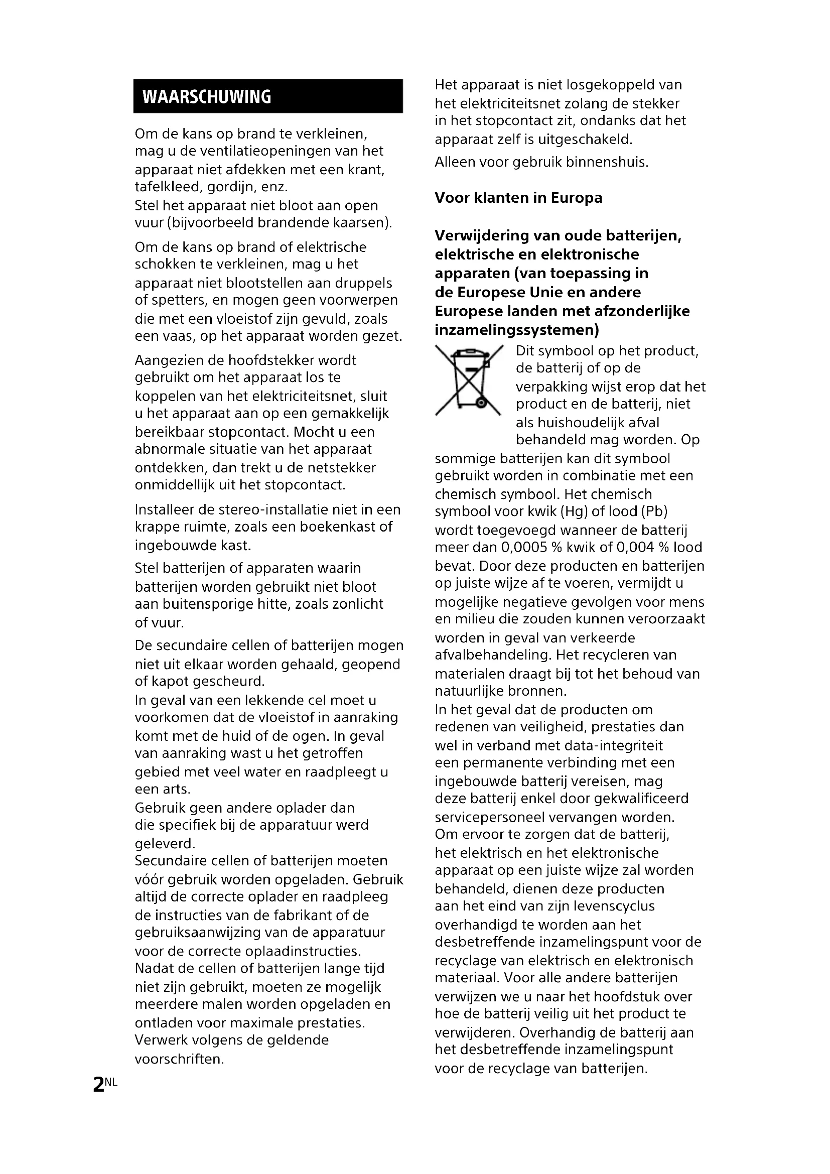 GTK-XB60/XB90.4-697-227-32(1) WAARSCHUWING Om de kans op brand te verkleinen, mag u de ventilatieopeningen van het apparaat niet afdekken met een krant, tafelkleed, gordijn, enz. Stel het apparaat niet bloot aan open vuur (bijvoorbeeld brandende kaarsen). Om de kans op brand of elektrische schokken te verkleinen, mag u het apparaat niet blootstellen aan druppels of spetters, en mogen geen voorwerpen die met een vloeistof zijn gevuld, zoals een vaas, op het apparaat worden gezet. Aangezien de hoofdstekker wordt gebruikt om het apparaat los te koppelen van het elektriciteitsnet, sluit u het apparaat aan op een gemakkelijk bereikbaar stopcontact. Mocht u een abnormale situatie van het apparaat ontdekken, dan trekt u de netstekker onmiddellijk uit het stopcontact. Installeer de stereo-installatie niet in een krappe ruimte, zoals een boekenkast of ingebouwde kast. Stel batterijen of apparaten waarin batterijen worden gebruikt niet bloot aan buitensporige hitte, zoals zonlicht of vuur. De secundaire cellen of batterijen mogen niet uit elkaar worden gehaald, geopend of kapot gescheurd. In geval van een lekkende cel moet u voorkomen dat de vloeistof in aanraking komt met de huid of de ogen. In geval van aanraking wast u het getroffen gebied met veel water en raadpleegt u een arts. Gebruik geen andere oplader dan die specifiek bij de apparatuur werd geleverd. Secundaire cellen of batterijen moeten vóór gebruik worden opgeladen. Gebruik altijd de correcte oplader en raadpleeg de instructies van de fabrikant of de gebruiksaanwijzing van de apparatuur voor de correcte oplaadinstructies. Nadat de cellen of batterijen lange tijd niet zijn gebruikt, moeten ze mogelijk meerdere malen worden opgeladen en ontladen voor maximale prestaties. Verwerk volgens de geldende voorschriften. Het apparaat is niet losgekoppeld van het elektriciteitsnet zolang de stekker in het stopcontact zit, ondanks dat het apparaat zelf is uitgeschakeld. Alleen voor gebruik binnenshuis. Voor klanten in Europa Verwijdering van oude batterijen, elektrische en elektronische apparaten (van toepassing in de Europese Unie en andere Europese landen met afzonderlijke inzamelingssystemen) Dit symbool op het product, de batterij of op de verpakking wijst erop dat het product en de batterij, niet als huishoudelijk afval behandeld mag worden. Op sommige batterijen kan dit symbool gebruikt worden in combinatie met een chemisch symbool. Het chemisch symbool voor kwik (Hg) of lood (Pb) wordt toegevoegd wanneer de batterij meer dan 0,0005 % kwik of 0,004 % lood bevat. Door deze producten en batterijen op juiste wijze af te voeren, vermijdt u mogelijke negatieve gevolgen voor mens en milieu die zouden kunnen veroorzaakt worden in geval van verkeerde afvalbehandeling. Het recycleren van materialen draagt bij tot het behoud van natuurlijke bronnen. In het geval dat de producten om redenen van veiligheid, prestaties dan wel in verband met data-integriteit een permanente verbinding met een ingebouwde batterij vereisen, mag deze batterij enkel door gekwalificeerd servicepersoneel vervangen worden. Om ervoor te zorgen dat de batterij, het elektrisch en het elektronische apparaat op een juiste wijze zal worden behandeld, dienen deze producten aan het eind van zijn levenscyclus overhandigd te worden aan het desbetreffende inzamelingspunt voor de recyclage van elektrisch en elektronisch materiaal. Voor alle andere batterijen verwijzen we u naar het hoofdstuk over hoe de batterij veilig uit het product te verwijderen. Overhandig de batterij aan het desbetreffende inzamelingspunt voor de recyclage van batterijen.3