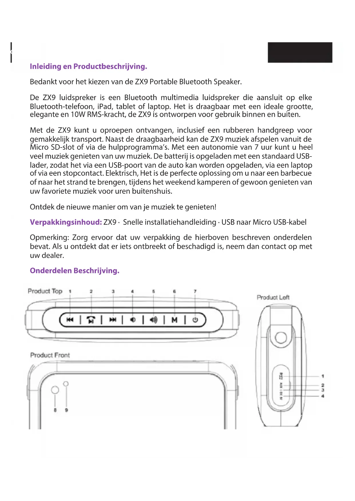 scaricare completamente la batteria e di eettuare tarie periodiche. Supporto tecnico: Si prega di visitare il nostro sito www.billowtechnology. com per ulteriori informazioni sull’installazione e la congurazione di questo prodotto.Nederlands Nederlands Inleiding en Productbeschrijving. Bedankt voor het kiezen van de ZX9 Portable Bluetooth Speaker. De ZX9 luidspreker is een Bluetooth multimedia luidspreker die aansluit op elke Bluetooth-telefoon, iPad, tablet of laptop. Het is draagbaar met een ideale grootte, elegante en 10W RMS-kracht, de ZX9 is ontworpen voor gebruik binnen en buiten. Met de ZX9 kunt u oproepen ontvangen, inclusief een rubberen handgreep voor gemakkelijk transport. Naast de draagbaarheid kan de ZX9 muziek afspelen vanuit de Micro SD-slot of via de hulpprogramma’s. Met een autonomie van 7 uur kunt u heel veel muziek genieten van uw muziek. De batterij is opgeladen met een standaard USB- lader, zodat het via een USB-poort van de auto kan worden opgeladen, via een laptop of via een stopcontact. Elektrisch, Het is de perfecte oplossing om u naar een barbecue of naar het strand te brengen, tijdens het weekend kamperen of gewoon genieten van uw favoriete muziek voor uren buitenshuis. Ontdek de nieuwe manier om van je muziek te genieten! Verpakkingsinhoud: ZX9 · Snelle installatiehandleiding · USB naar Micro USB-kabel Opmerking: Zorg ervoor dat uw verpakking de hierboven beschreven onderdelen bevat. Als u ontdekt dat er iets ontbreekt of beschadigd is, neem dan contact op met uw dealer. Onderdelen Beschrijving.Nederlands