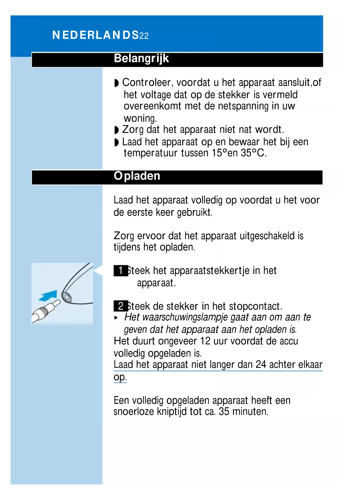 7 Breek de accu los van het kunststof gedeelte met behulp van een schroevendraaier. 8 Zorg voor een milieuvriendelijke verwerking van de accu en de andere onderdelen. Sluit het apparaat niet meer aan op netspanning nadat u het geopend heeft! Zie het 'worldwide guarantee' vouwblad voor telefoonnummers van de Philips Helpdesk. NEDERLANDS 27Importante ◗ Antes de enchufar el aparato, compruebe que el voltaje indicado en la clavija de red se corresponde con el de su hogar. ◗ Asegúrese de que el aparato no se moje. ◗ Cargue y guarde el aparato a una temperatura entre 15 y 35 ºC. Cómo cargar el aparato Antes de usarlo por primera vez, cargue completamente el aparato. Asegúrese de que el aparato esté en la posición "apagado" mientras se carga.