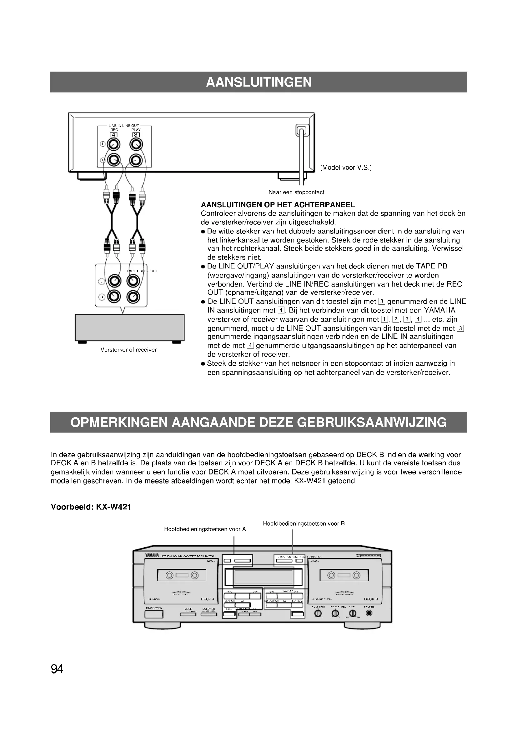 Controleer alvorens de aansluitingen te maken dat de spanning van het deck èn de versterker/receiver zijn uitgeschakeld. ÷ De witte stekker van het dubbele aansluitingssnoer dient in de aansluiting van het linkerkanaal te worden gestoken. Steek de rode stekker in de aansluiting van het rechterkanaal. Steek beide stekkers goed in de aansluiting. Verwissel de stekkers niet. ÷ De LINE OUT/PLAY aansluitingen van het deck dienen met de TAPE PB (weergave/ingang) aansluitingen van de versterker/receiver te worden verbonden. Verbind de LINE IN/REC aansluitingen van het deck met de REC OUT (opname/uitgang) van de versterker/receiver. ÷ De LINE OUT aansluitingen van dit toestel zijn met 3 genummerd en de LINE IN aansluitingen met 4. Bij het verbinden van dit toestel met een YAMAHA versterker of receiver waarvan de aansluitingen met 1, 2, 3, 4 ... etc. zijn genummerd, moet u de LINE OUT aansluitingen van dit toestel met de met 3 genummerde ingangsaansluitingen verbinden en de LINE IN aansluitingen met de met 4 genummerde uitgangsaansluitingen op het achterpaneel van de versterker of receiver. ÷ Steek de stekker van het netsnoer in een stopcontact of indien aanwezig in een spanningsaansluiting op het achterpaneel van de versterker/receiver. (Model voor V.S.) Versterker of receiverHoofdbedieningstoetsen voor BHoofdbedieningstoetsen voor ANATURAL SOUND CASSETTE DECK KX-W421DOLBY NR