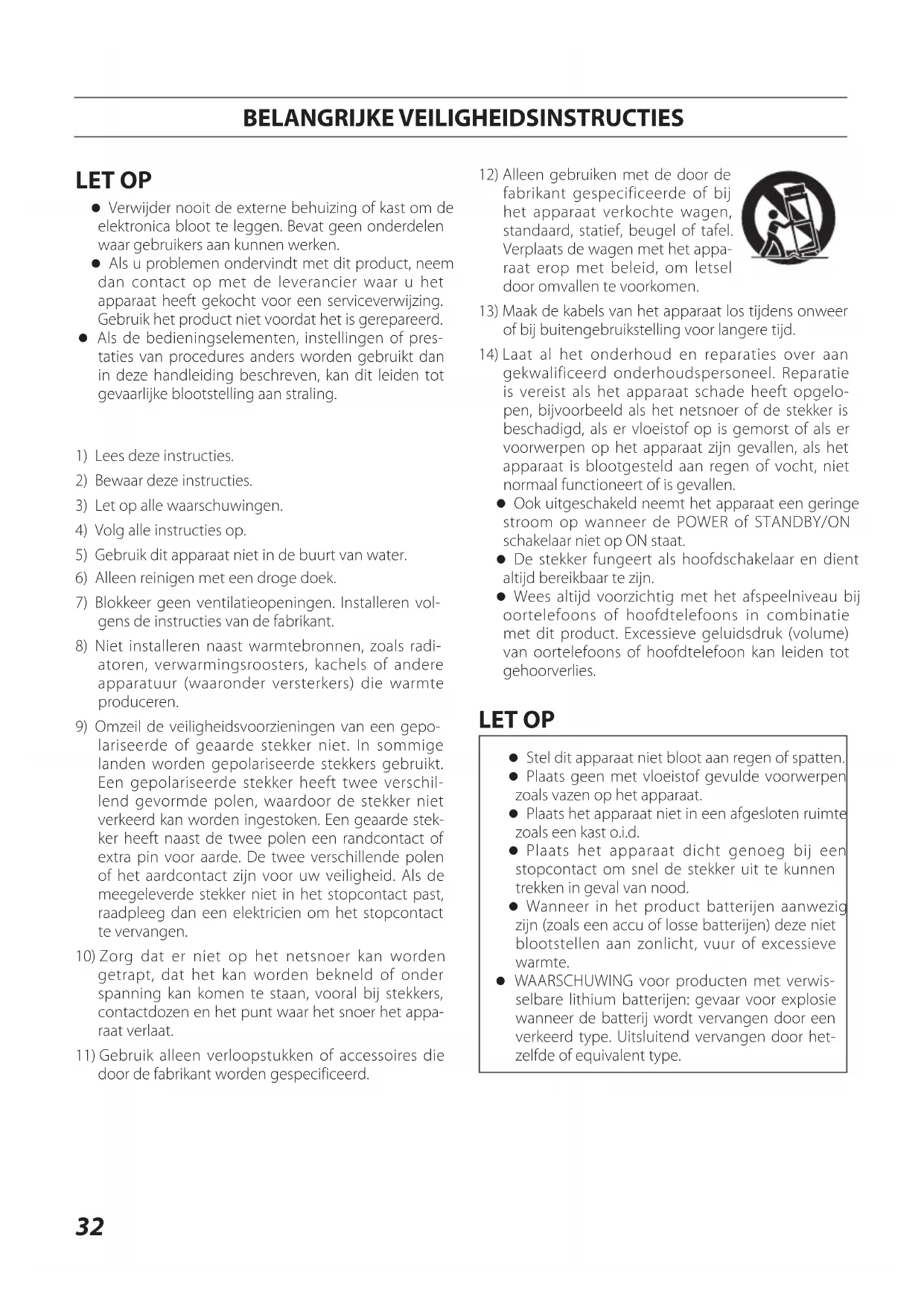 - Minimaliseer het volume alvorens de apparatuur in te schakelen. Inschakelen terwijl er een luid volume binnenkomt, kan de luidsprekers beschadigen.