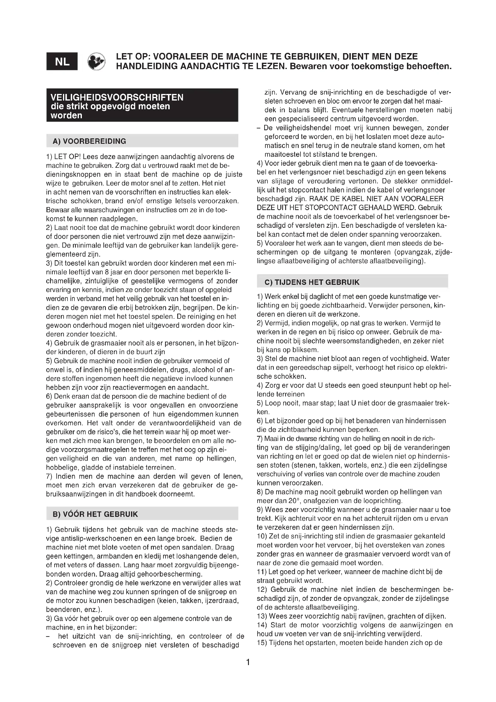 LET OP: VOORALEER DE MACHINE TE GEBRUIKEN, DIENT MEN DEZE HANDLEIDING AANDACHTIG TE LEZEN. Bewaren voor toekomstige behoeften. zijn. Vervang de snij-inrichting en de beschadigde of ver- sleten schroeven en bloc om ervoor te zorgen dat het maai- dek in balans blijft. Eventuele herstellingen moeten nabij een gespecialiseerd centrum uitgevoerd worden. – De veiligheidshendel moet vrij kunnen bewegen, zonder geforceerd te worden, en bij het loslaten moet deze auto- matisch en snel terug in de neutrale stand komen, om het maaitoestel tot stilstand te brengen.