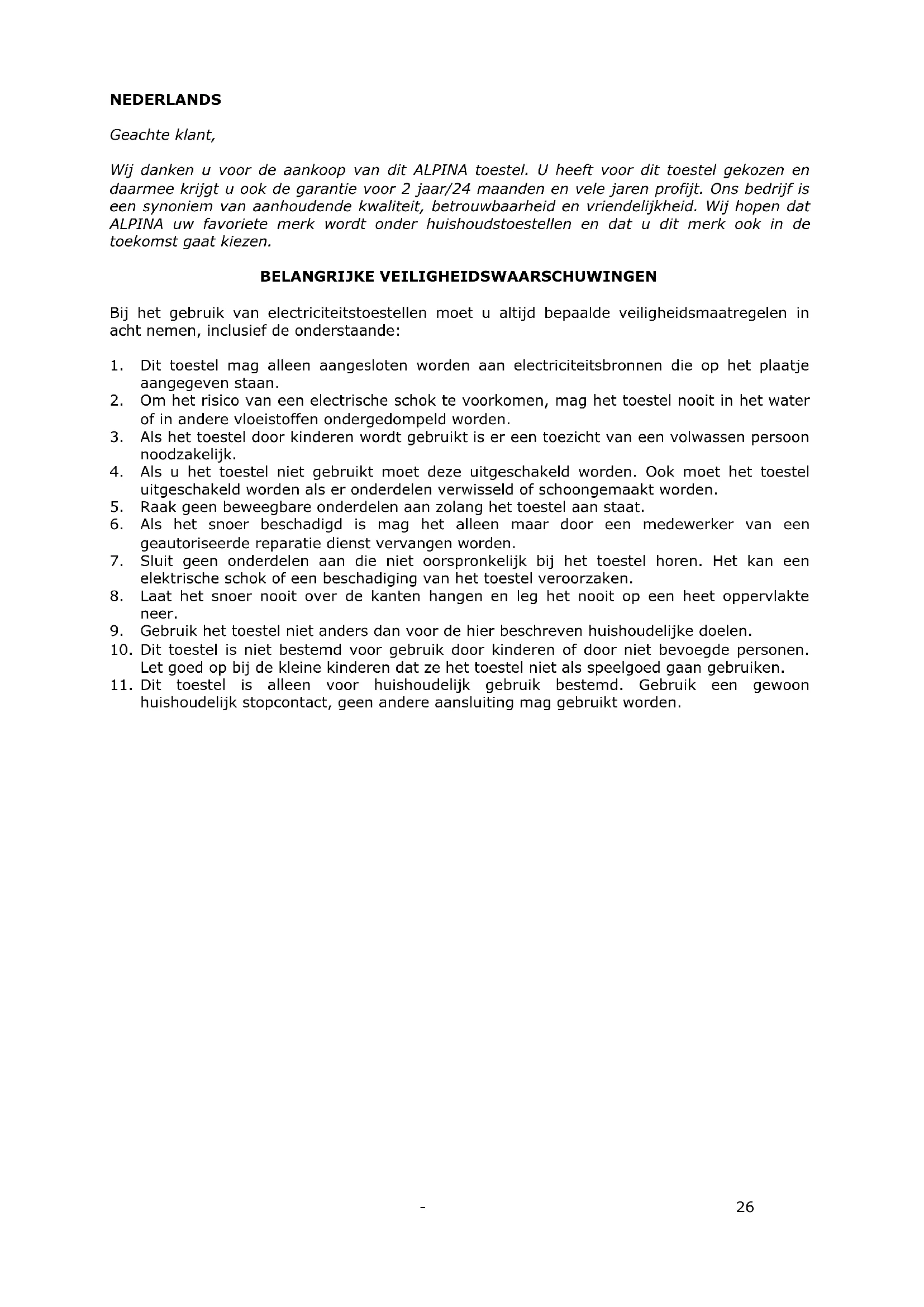 Wij danken u voor de aankoop van dit ALPINA toestel. U heeft voor dit toestel gekozen en daarmee krijgt u ook de garantie voor 2 jaar/24 maanden en vele jaren profijt. Ons bedrijf is een synoniem van aanhoudende kwaliteit, betrouwbaarheid en vriendelijkheid. Wij hopen dat ALPINA uw favoriete merk wordt onder huishoudstoestellen en dat u dit merk ook in de toekomst gaat kiezen.