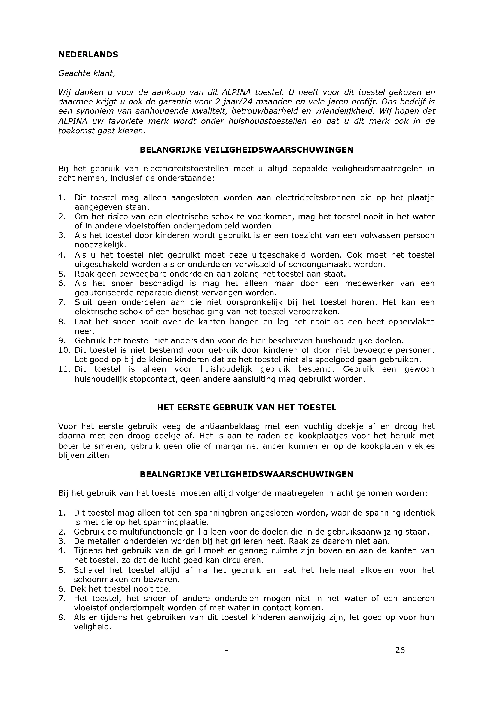 Geachte klant, Wij danken u voor de aankoop van dit ALPINA toestel. U heeft voor dit toestel gekozen en daarmee krijgt u ook de garantie voor 2 jaar/24 maanden en vele jaren profijt. Ons bedrijf is een synoniem van aanhoudende kwaliteit, betrouwbaarheid en vriendelijkheid. Wij hopen dat ALPINA uw favoriete merk wordt onder huishoudstoestellen en dat u dit merk ook in de toekomst gaat kiezen. BELANGRIJKE VEILIGHEIDSWAARSCHUWINGEN Bij het gebruik van electriciteitstoestellen moet u altijd bepaalde veiligheidsmaatregelen in acht nemen, inclusief de onderstaande: