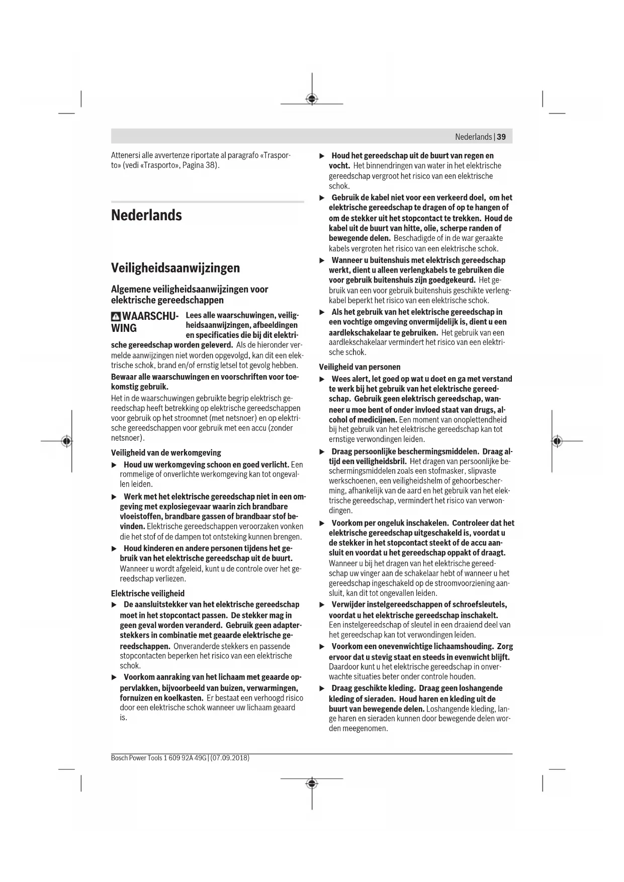 della lunghezza di avvitamento. Manutenzione ed assistenza Manutenzione e pulizia u Prima di qualsiasi intervento sull’elettroutensile (ad es. interventi di manutenzione, sostituzione dell’ac- cessorio ecc.), prelevare la batteria, anche nel caso in cui occorra trasportarlo o conservarlo. In caso di azio- namento accidentale dell’interruttore di avvio/arresto sussiste pericolo di lesioni. u Per poter garantire buone e sicure operazioni di lavo- ro, tenere sempre pulite l’elettroutensile e le fessure di ventilazione. Se nonostante gli accurati procedimenti di produzione e di controllo l’elettroutensile dovesse guastarsi, la riparazione va fatta effettuare da un punto di assistenza autorizzato per gli elettroutensili Bosch. Servizio di assistenza e consulenza tecnica Il servizio di assistenza risponde alle Vostre domande relati- ve alla riparazione e alla manutenzione del Vostro prodotto nonché concernenti i pezzi di ricambio. Disegni in vista esplosa e informazioni relative ai pezzi di ricambio sono con- sultabili anche sul sito www.bosch-pt.com Il team di consulenza tecnica Bosch sarà lieto di rispondere alle Vostre domande in merito ai nostri prodotti e accessori. In caso di richieste o di ordinazione di pezzi di ricambio, co- municare sempre il codice prodotto a 10cifre riportato sulla targhetta di fabbricazione dell’elettroutensile. Italia Officina Elettroutensili Robert Bosch S.p.A. Corso Europa 2/A 20020 LAINATE (MI) Tel.: (02) 3696 2663 Fax: (02) 3696 2662 Fax: (02) 3696 8677 E-Mail: officina.elettroutensili@it.bosch.com Svizzera Sul sito www.bosch-pt.com/ch/it è possible ordinare diret- tamente on-line i ricambi. Tel.: (044) 8471513 Fax: (044) 8471553 E-Mail: Aftersales.Service@de.bosch.com Trasporto Le batterie al litio contenute sono soggette ai requisiti di leg- ge relativi a merci pericolose. Le batterie possono essere trasportate su strada tramite l’utente senza ulteriori precau- zioni. In caso di spedizione tramite terzi (ad es. per via aerea o tra- mite spedizioniere), andranno rispettati specifici requisiti relativi d’imballaggio e contrassegnatura. In tale caso, per la preparazione dell’articolo da spedire, andrà consultato uno specialista in merci pericolose. Inviare le batterie soltanto se la relativa carcassa non è dan- neggiata. Coprire con nastro adesivo i contatti scoperti ed imballare la batteria in modo che non possa spostarsi nell’imballaggio. Andranno altresì rispettate eventuali ulte- riori norme nazionali complementari. Smaltimento Avviare ad un riciclaggio rispettoso dell’am- biente elettroutensili, batterie, accessori ed imballaggi non più impiegabili. Non gettare elettroutensili e batterie/pile tra i rifiuti domestici! Solo per i Paesi UE: Conformemente alla direttiva europea 2012/19/UE, gli elet- troutensili non più utilizzabili e, in base alla direttiva europea 2006/66/CE, le batterie/le pile difettose o esauste, andran- no raccolti separatamente ed avviati ad un riutilizzo rispetto- so dell’ambiente. Batterie/pile: Per le batterie al litio:Attenersi alle avvertenze riportate al paragrafo «Traspor- to» (vedi «Trasporto», Pagina38). Nederlands Veiligheidsaanwijzingen Algemene veiligheidsaanwijzingen voor elektrische gereedschappen WAARSCHU- WING Lees alle waarschuwingen, veilig- heidsaanwijzingen, afbeeldingen en specificaties die bij dit elektri- sche gereedschap worden geleverd. Als de hieronder ver- melde aanwijzingen niet worden opgevolgd, kan dit een elek- trische schok, brand en/of ernstig letsel tot gevolg hebben. Bewaar alle waarschuwingen en voorschriften voor toe- komstig gebruik. Het in de waarschuwingen gebruikte begrip elektrisch ge- reedschap heeft betrekking op elektrische gereedschappen voor gebruik op het stroomnet (met netsnoer) en op elektri- sche gereedschappen voor gebruik met een accu (zonder netsnoer). Veiligheid van de werkomgeving u Houd uw werkomgeving schoon en goed verlicht. Een rommelige of onverlichte werkomgeving kan tot ongeval- len leiden. u Werk met het elektrische gereedschap niet in een om- geving met explosiegevaar waarin zich brandbare vloeistoffen, brandbare gassen of brandbaar stof be- vinden. Elektrische gereedschappen veroorzaken vonken die het stof of de dampen tot ontsteking kunnen brengen. u Houd kinderen en andere personen tijdens het ge- bruik van het elektrische gereedschap uit de buurt. Wanneer u wordt afgeleid, kunt u de controle over het ge- reedschap verliezen. Elektrische veiligheid u De aansluitstekker van het elektrische gereedschap moet in het stopcontact passen. De stekker mag in geen geval worden veranderd. Gebruik geen adapter- stekkers in combinatie met geaarde elektrische ge- reedschappen. Onveranderde stekkers en passende stopcontacten beperken het risico van een elektrische schok. u Voorkom aanraking van het lichaam met geaarde op- pervlakken, bijvoorbeeld van buizen, verwarmingen, fornuizen en koelkasten. Er bestaat een verhoogd risico door een elektrische schok wanneer uw lichaam geaard is. u Houd het gereedschap uit de buurt van regen en vocht. Het binnendringen van water in het elektrische gereedschap vergroot het risico van een elektrische schok. u Gebruik de kabel niet voor een verkeerd doel, om het elektrische gereedschap te dragen of op te hangen of om de stekker uit het stopcontact te trekken. Houd de kabel uit de buurt van hitte, olie, scherpe randen of bewegende delen. Beschadigde of in de war geraakte kabels vergroten het risico van een elektrische schok. u Wanneer u buitenshuis met elektrisch gereedschap werkt, dient u alleen verlengkabels te gebruiken die voor gebruik buitenshuis zijn goedgekeurd. Het ge- bruik van een voor gebruik buitenshuis geschikte verleng- kabel beperkt het risico van een elektrische schok. u Als het gebruik van het elektrische gereedschap in een vochtige omgeving onvermijdelijk is, dient u een aardlekschakelaar te gebruiken. Het gebruik van een aardlekschakelaar vermindert het risico van een elektri- sche schok. Veilighei