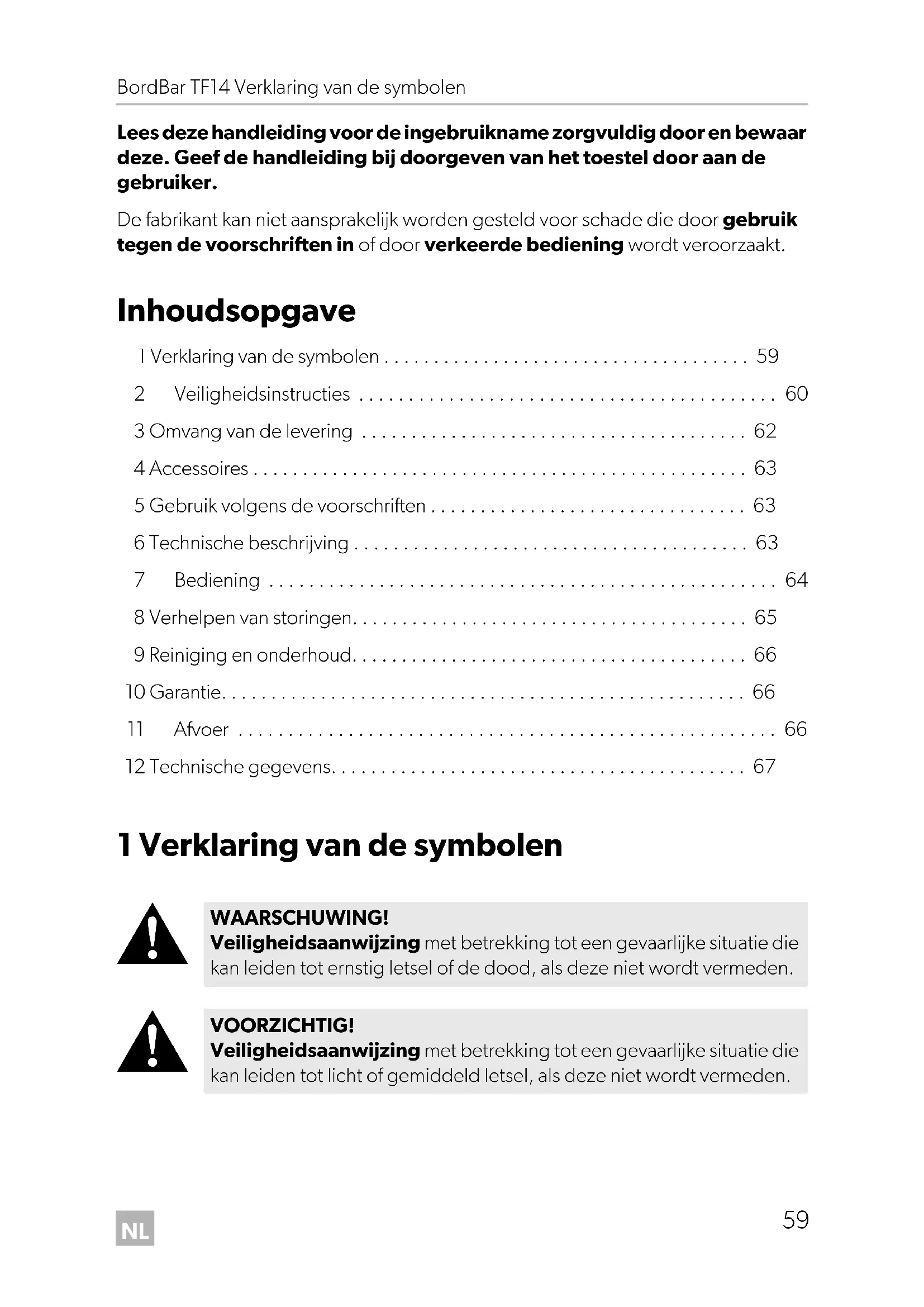 - Lees deze handleiding voor de ingebruikname zorgvuldig door en bewaar deze. Geef de handleiding bij doorgeven van het toestel door aan de gebruiker. De fabrikant kan niet aansprakelijk worden gesteld voor schade die door gebruik tegen de voorschriften in of door verkeerde bediening wordt veroorzaakt. Inhoudsopgave 1 Verklaring van de symbolen p. 59