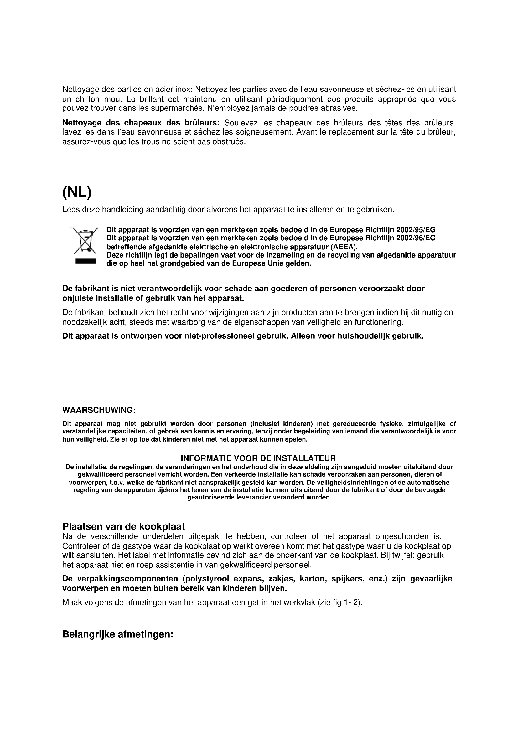 Let op: Het gebruik van een gaskooktoestel veroorzaakt warmte en vochtigheid in de ruimte waar het geinstalleerd is.