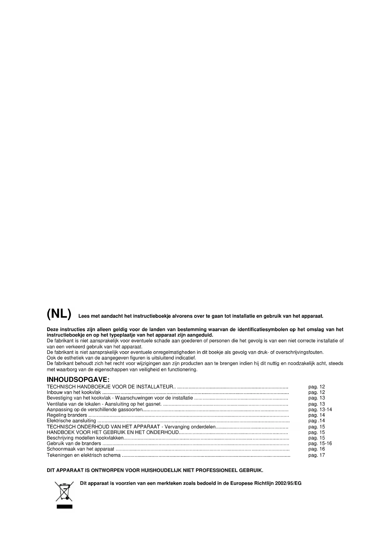 DIT APPARAAT IS ONTWORPEN VOOR HUISHOUDELIJK NIET PROFESSIONEEL GEBRUIK. Dit apparaat is voorzien van een merkteken zoals bedoeld in de Europese Richtlijn 2002/95/EGDit apparaat is voorzien van een merkteken zoals bedoeld in de Europese Richtlijn 2002/96/EG betreffende afgedankte elektrische en elektronische apparatuur (AEEA). Deze richtlijn legt de bepalingen vast voor de inzameling en de recycling van afgedankte apparatuur die op heel het grondgebied van de Europese Unie gelden.
