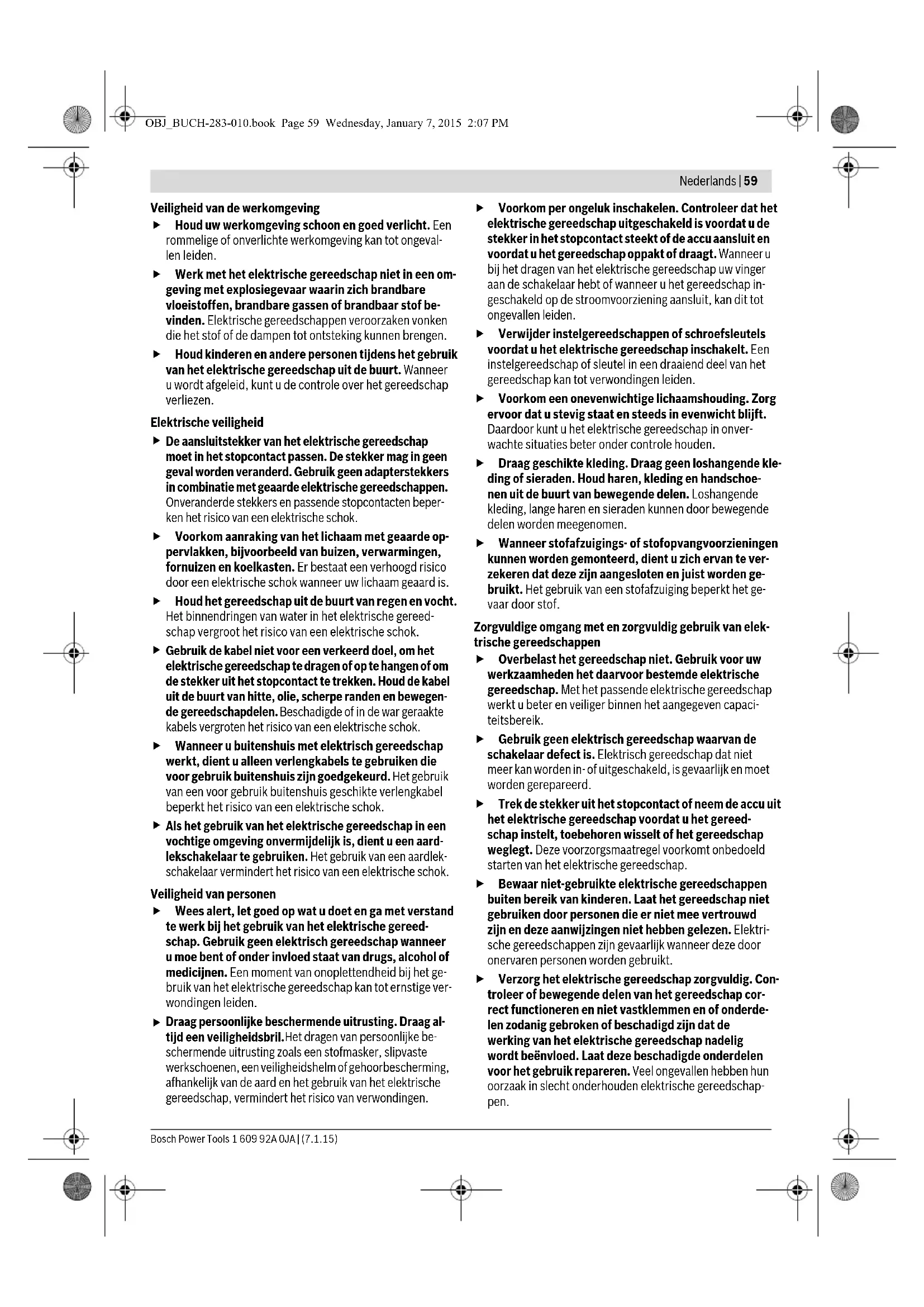 Draag persoonlijke beschermende uitrusting. Draag al- tijd een veiligheidsbril. Het dragen van persoonlijke be- schermende uitrusting zoals een stofmasker, slipvaste werkschoenen, een veiligheidshelm of gehoorbescherming, afhankelijk van de aard en het gebruik van het elektrische gereedschap, vermindert het risico van verwondingen. Voorkom per ongeluk inschakelen. Controleer dat het elektrische gereedschap uitgeschakeld is voordat u de stekker in het stopcontact steekt of de accu aansluit en voordat u het gereedschap oppakt of draagt. Wanneer u bij het dragen van het elektrische gereedschap uw vinger aan de schakelaar hebt of wanneer u het gereedschap in- geschakeld op de stroomvoorziening aansluit, kan dit tot ongevallen leiden. Verwijder instelgereedschappen of schroefsleutels voordat u het elektrische gereedschap inschakelt. Een instelgereedschap of sleutel in een draaiend deel van het gereedschap kan tot verwondingen leiden. Voorkom een onevenwichtige lichaamshouding. Zorg ervoor dat u stevig staat en steeds in evenwicht blijft. Daardoor kunt u het elektrische gereedschap in onver- wachte situaties beter onder controle houden. Draag geschikte kleding. Draag geen loshangende kle- ding of sieraden. Houd haren, kleding en handschoe- nen uit de buurt van bewegende delen. Loshangende kleding, lange haren en sieraden kunnen door bewegende delen worden meegenomen. Wanneer stofafzuigings- of stofopvangvoorzieningen kunnen worden gemonteerd, dient u zich ervan te ver- zekeren dat deze zijn aangesloten en juist worden ge- bruikt. Het gebruik van een stofafzuiging beperkt het ge- vaar door stof. Zorgvuldige omgang met en zorgvuldig gebruik van elek- trische gereedschappen Overbelast het gereedschap niet. Gebruik voor uw werkzaamheden het daarvoor bestemde elektrische gereedschap. Met het passende elektrische gereedschap werkt u beter en veiliger binnen het aangegeven capaci- teitsbereik. Gebruik geen elektrisch gereedschap waarvan de schakelaar defect is. Elektrisch gereedschap dat niet meer kan worden in- of uitgeschakeld, is gevaarlijk en moet worden gerepareerd. Trek de stekker uit het stopcontact of neem de accu uit het elektrische gereedschap voordat u het gereed- schap instelt, toebehoren wisselt of het gereedschap weglegt. Deze voorzorgsmaatregel voorkomt onbedoeld starten van het elektrische gereedschap. Bewaar niet-gebruikte elektrische gereedschappen buiten bereik van kinderen. Laat het gereedschap niet gebruiken door personen die er niet mee vertrouwd zijn en deze aanwijzingen niet hebben gelezen. Elektri- sche gereedschappen zijn gevaarlijk wanneer deze door onervaren personen worden gebruikt. Verzorg het elektrische gereedschap zorgvuldig. Con- troleer of bewegende delen van het gereedschap cor- rect functioneren en niet vastklemmen en of onderde- len zodanig gebroken of beschadigd zijn dat de werking van het elektrische gereedschap nadelig wordt beënvloed. Laat deze beschadigde onderdelen voor het gebruik repareren. Veel ongevallen hebben hun oorzaak in slecht onderhouden elektrische gereedschap- pen. OBJ_BUCH-283-010.book Page 59 Wednesday, January 7, 2015 2:07 PM60 | Nederlands 1 609 92A 0JA | (7.1.15) Bosch Power Tools Houd snijdende inzetgereedschappen scherp en schoon. Zorgvuldig onderhouden snijdende inzetgereed- schappen met scherpe snijkanten klemmen minder snel vast en zijn gemakkelijker te geleiden. Gebruik elektrisch gereedschap, toebehoren, inzetge- reedschappen en dergelijke volgens deze aanwijzin- gen. Let daarbij op de arbeidsomstandigheden en de uit te voeren werkzaamheden. Het gebruik van elektri- sche gereedschappen voor andere dan de voorziene toe- passingen kan tot gevaarlijke situaties leiden. Gebruik en onderhoud van accugereedschappen Laad accu’s alleen op in oplaadapparaten die door de fabrikant worden geadviseerd. Voor een oplaadappa- raat dat voor een bepaald type accu geschikt is, bestaat brandgevaar wanneer het met andere accu’s wordt ge- bruikt. Gebruik alleen de daarvoor bedoelde accu’s in de elek- trische gereedschappen. Het gebruik van andere accu’s kan tot verwondingen en brandgevaar leiden. Voorkom aanraking van de niet-gebruikte accu met pa- perclips, munten, sleutels, spijkers, schroeven en an- dere kleine metalen voorwerpen die overbrugging van de contacten kunnen veroorzaken. Kortsluiting tussen de accucontacten kan brandwonden of brand tot gevolg hebben. Bij verkeerd gebruik kan vloeistof uit de accu lekken. Voorkom contact daarmee. Spoel bij onvoorzien con- tact met water af. Wanneer de vloeistof in de ogen komt, dient u bovendien een arts te raadplegen. Gelek- te accuvloeistof kan tot huidirritaties en verbrandingen lei- den. Service Laat het elektrische gereedschap alleen repareren door gekwalificeerd en vakkundig personeel en alleen met originele vervangingsonderdelen. Daarmee wordt gewaarborgd dat de veiligheid van het gereedschap in stand blijft. Veiligheidsvoorschriften voor hamers Draag een gehoorbescherming. De blootstelling aan la- waai kan gehoorverlies tot gevolg hebben. Gebruik extra grepen als deze bij het elektrische ge- reedschap geleverd worden. Het verlies van de controle kan tot verwondingen leiden. Houd het gereedschap aan de geïsoleerde greepvlak- ken vast als u werkzaamheden uitvoert waarbij het in- zetgereedschap verborgen stroomleidingen kan ra- ken. Contact met een onder spanning staande leiding kan ook metalen delen van het gereedschap onder spanning zetten en tot een elektrische schok leiden. Gebruik een geschikt detectieapparaat om verborgen stroom-, gas- of waterleidingen op te sporen of raad- pleeg het plaatselijke energie- of waterleidingbedrijf. Contact met elektrische leidingen kan tot brand of een elektrische schok leiden. Beschadiging van een gasleiding kan tot een explosie leiden. Breuk van een waterleiding veroorzaakt materiële schade. Houd het elektrische gereedschap tijdens de werk- zaamheden stevig met beide handen vast en zorg er- voor dat u stevig staat. Het elektrische gereedschap wordt me